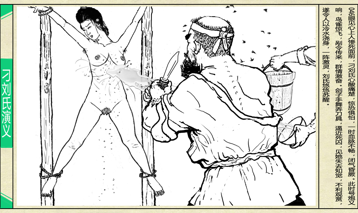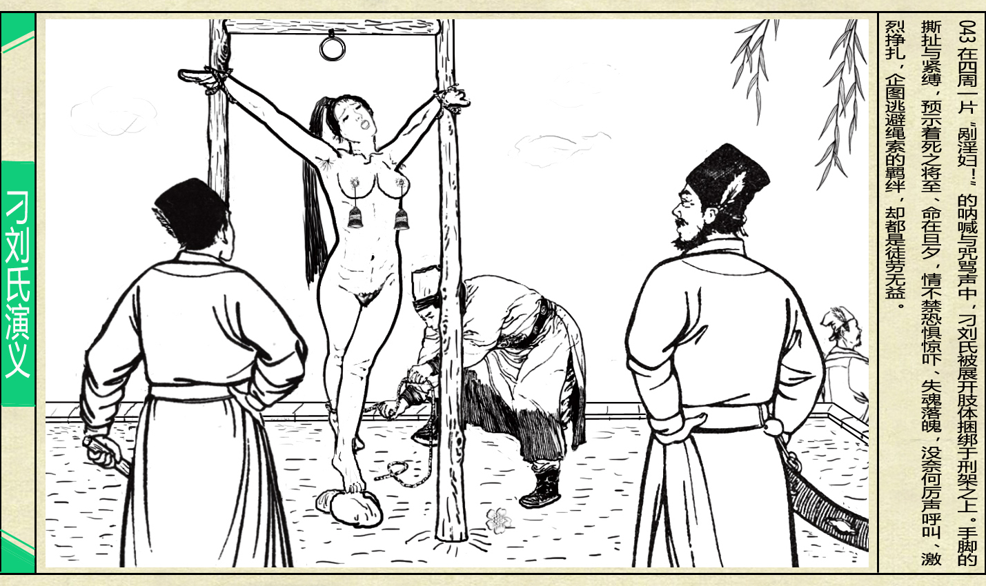 在四周一片 “剐淫妇!” 的呐喊与咒骂声中, 刁刘氏被展开肢体捆绑于刑架之上.
