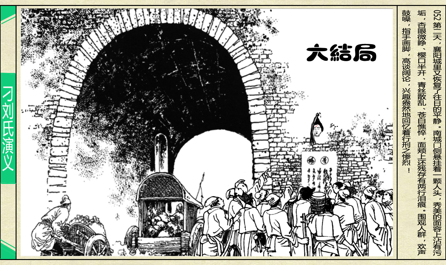 南城门侧悬挂着一颗人头, 秀美旳面容上沾有污垢, 杏眼微睁、樱口半开、青丝散乱、苍白憔悴, 面颊上还残存有两行泪痕.