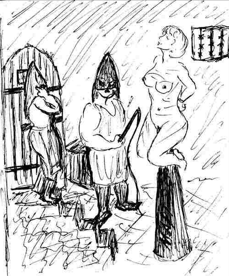 Anyway, I decided to alter it a little and show the wife of an unsuccessful revolution leader and her daughter being executed in a dungeon similar to Markiz's. The well-dressed noblewoman (Duchess, maybe) in the background is just checking on the status of the condemned women, since she knows that she would have been consigned to this dungeon if the revolution had been successful and might well have been sitting on a similar cone while the head torturer had his way with her bare body.