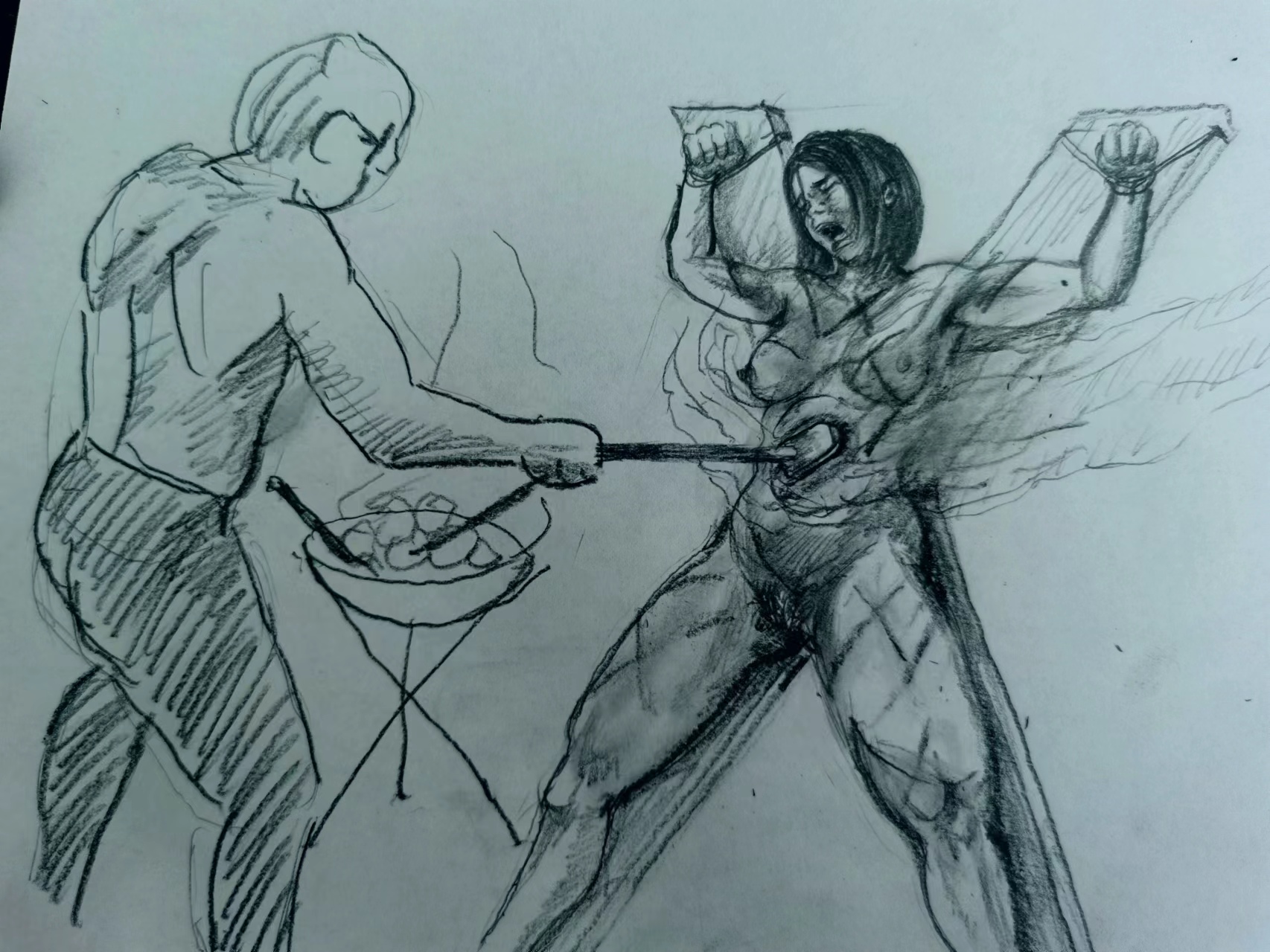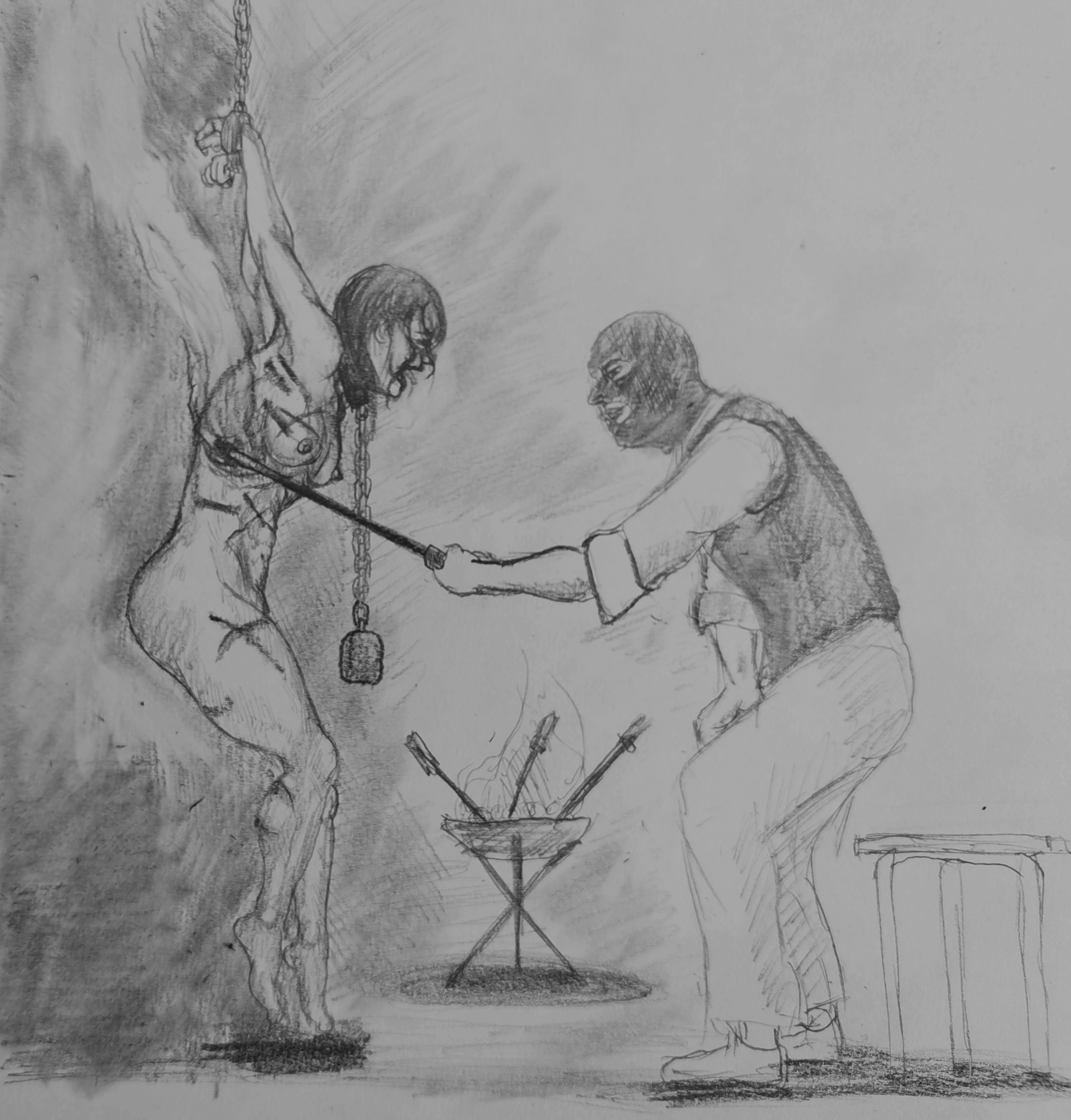 This is one of your best yet, imo. It has a couple of my favorites.... a severe strappado and hot irons. Her body position is right on and another great facial expression (on the torturer too). I really like this one, and thank you for sharing as always.