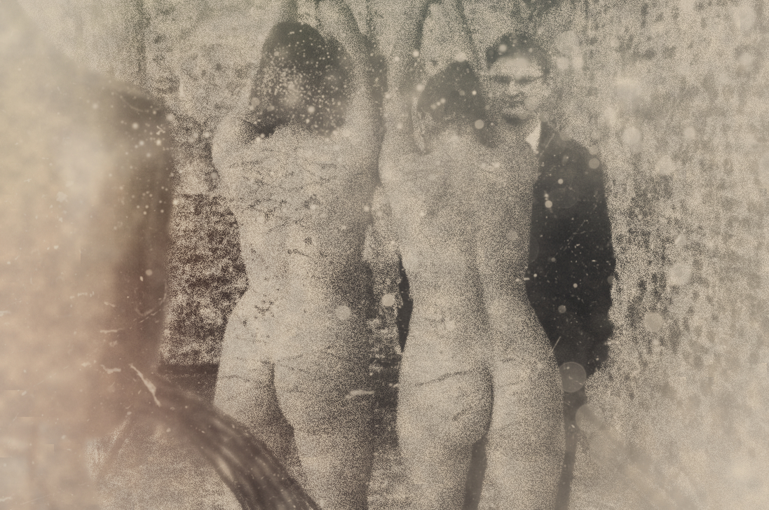 This photograph has not worn well. It appears to depict two women being flogged. Possibly an interrogation of conditioning of some sort.