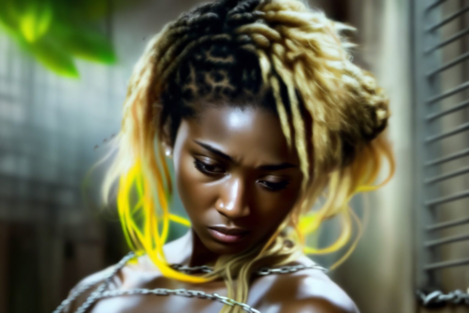 Brunette version, about to be assaulted from behind by a huge man. Mostly photorealistic.