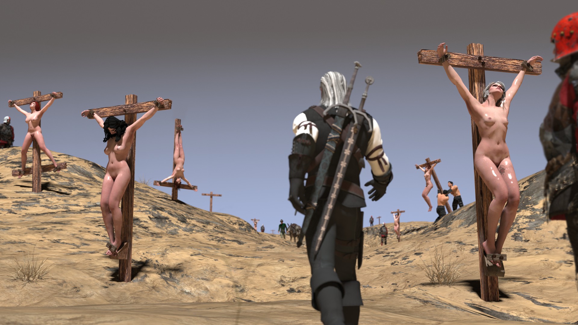Enslaved lodge's sorceresses and some others, deemed too weak for the hardship of the wheel are sold in the market as pleasure slaves. Each slave is positioned for easy inspection and for tasting the product. Some are resigned with their fate, some are struggling in their stocks. Potential buyers are already parading through the stalls, looking, checking prices, trying the merchandise if they like what they see.