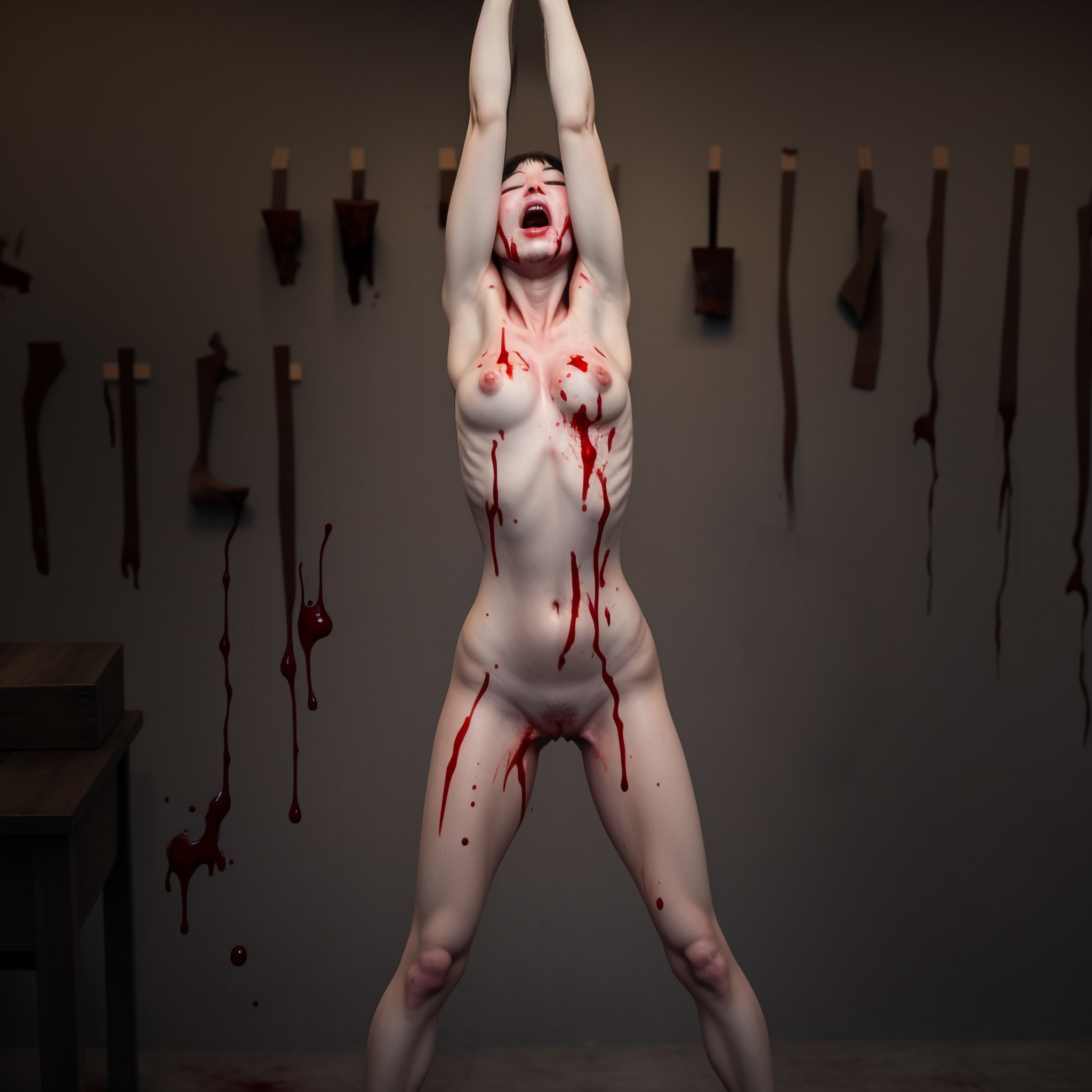 In the old warehouse, they stripped her naked and pulled her up into a straining spreadeagle in front of a crowd of enthusiastic gang members.