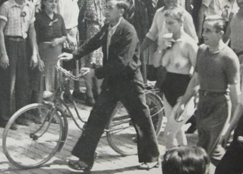 Her head shaved and her hair displayed to the jeering crowd.