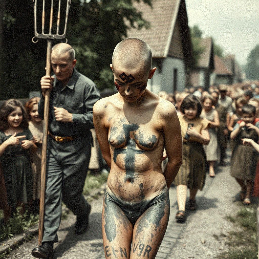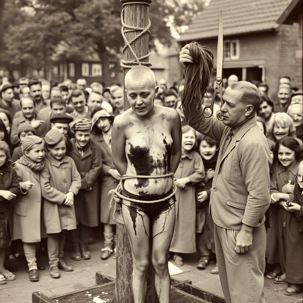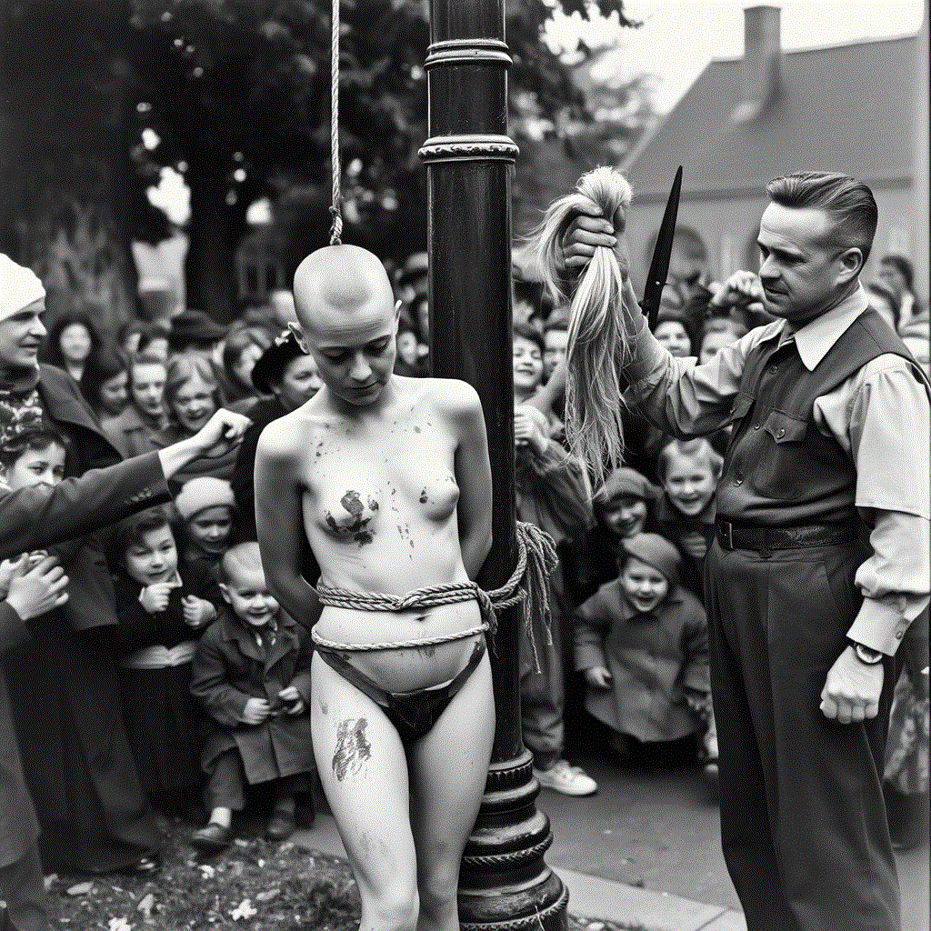 This is a historical postcard or souvenir that an allied soldier could send or bring home. It may sound weird, but I envy the blessed unfortunate lady in this picture. I’m afraid it’s rather unlikely, but all the same I hope for her, that she is masochistic and exhibitionistic enough, to secretly enjoy her walk of shame, her social doom – as I do in my fantasies. I wonder in what order the fortunate little traitor was so excitingly shamed. She knew that she had to expect some ruthless ‘purification’ treatment, as the cheering mob dragged her out of the house. I would have been very excited in her place. Would my clothes be ripped off my body, or would I be ordered to strip naked and I would obey knowing that resistance is useless? If I could choose, I would prefer to be forced to perform an involuntary embarrassing striptease. With every piece of cloth that drops to the ground I expose my body more and more until I’m stark naked. I would shiver with agonizing shame and, to my horror, of sexual arousal. The merciless jeers of the mob would increase my shame and arousal even more. Different from the picture I would have to walk barefoot – why should a ‘Nazi Whore’ be allowed to wear shoes? If I may make a wish – I would really enjoy wearing a wicked little accessory: Can my hands please be handcuffed on my back? Oh yes, that feels great! Now I’m perfectly helpless, delivered to the vulgarity of the enthusiastically celebrating mob.