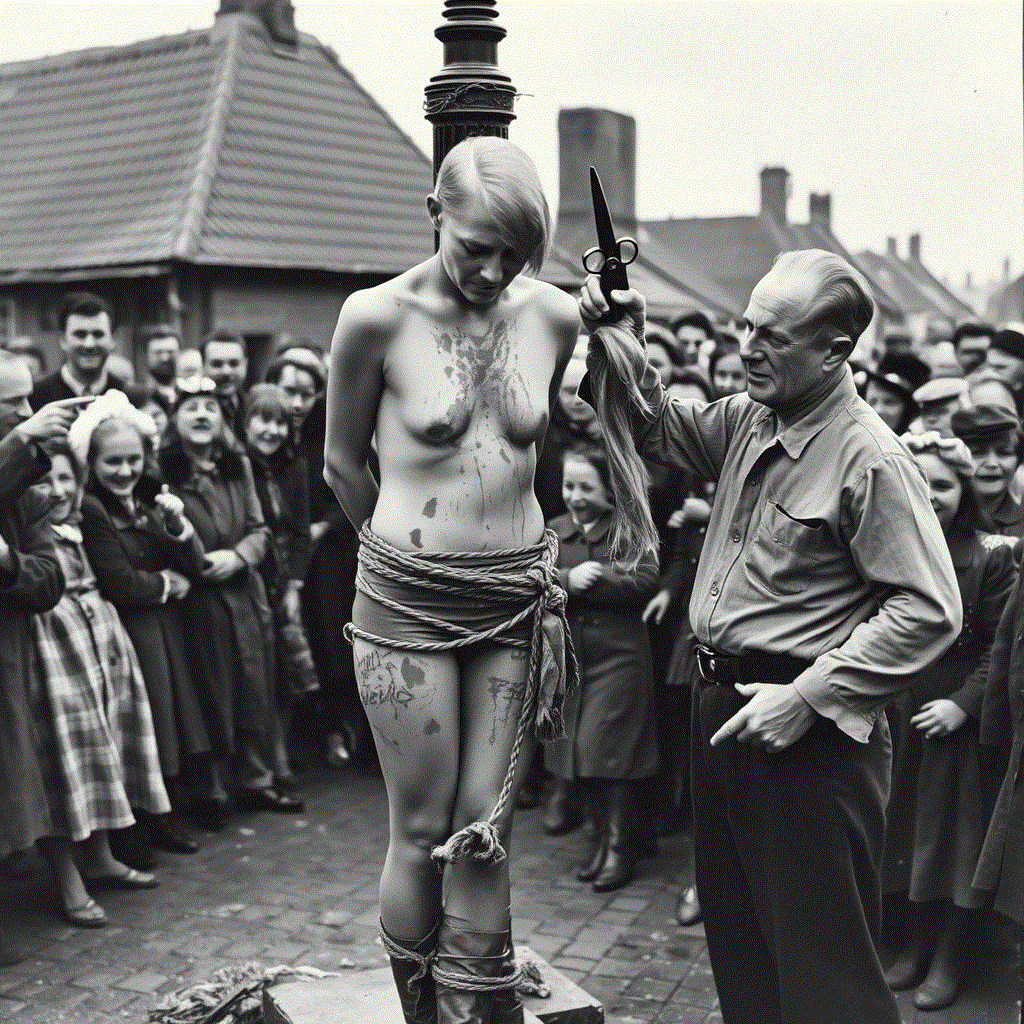 This is a historical postcard or souvenir that an allied soldier could send or bring home. It may sound weird, but I envy the blessed unfortunate lady in this picture. I’m afraid it’s rather unlikely, but all the same I hope for her, that she is masochistic and exhibitionistic enough, to secretly enjoy her walk of shame, her social doom – as I do in my fantasies. I wonder in what order the fortunate little traitor was so excitingly shamed. She knew that she had to expect some ruthless ‘purification’ treatment, as the cheering mob dragged her out of the house. I would have been very excited in her place. Would my clothes be ripped off my body, or would I be ordered to strip naked and I would obey knowing that resistance is useless? If I could choose, I would prefer to be forced to perform an involuntary embarrassing striptease. With every piece of cloth that drops to the ground I expose my body more and more until I’m stark naked. I would shiver with agonizing shame and, to my horror, of sexual arousal. The merciless jeers of the mob would increase my shame and arousal even more. Different from the picture I would have to walk barefoot – why should a ‘Nazi Whore’ be allowed to wear shoes? If I may make a wish – I would really enjoy wearing a wicked little accessory: Can my hands please be handcuffed on my back? Oh yes, that feels great! Now I’m perfectly helpless, delivered to the vulgarity of the enthusiastically celebrating mob.