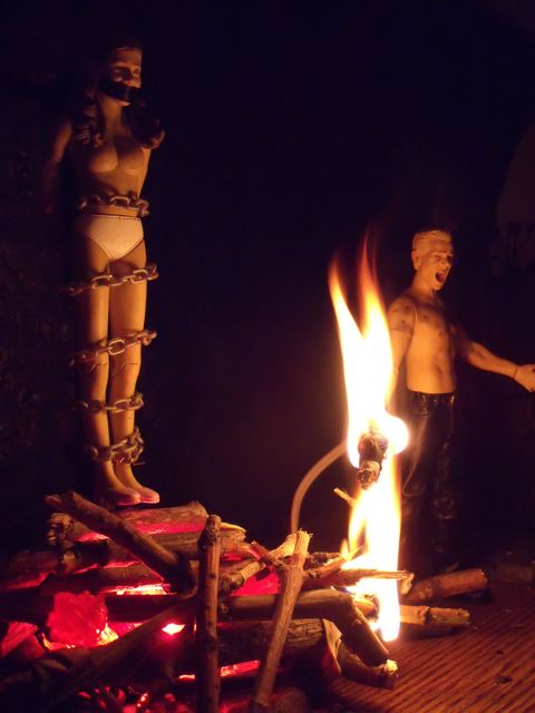 I have a friend named Cannon who collects female action figures, ties them up and displays them in his own little torture dungeon. It's really quite amusing. For a while, I gave him his own section at this site. To thank me, he asked if I would like any custom pics taken. I had one request...can you take some burning at the stake pics with Michelle Trachtenberg? He obliged. Here's a few of them.