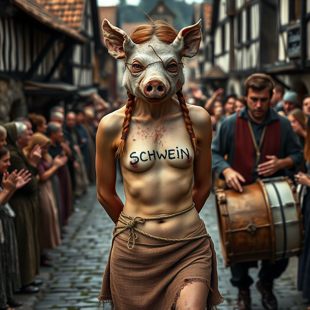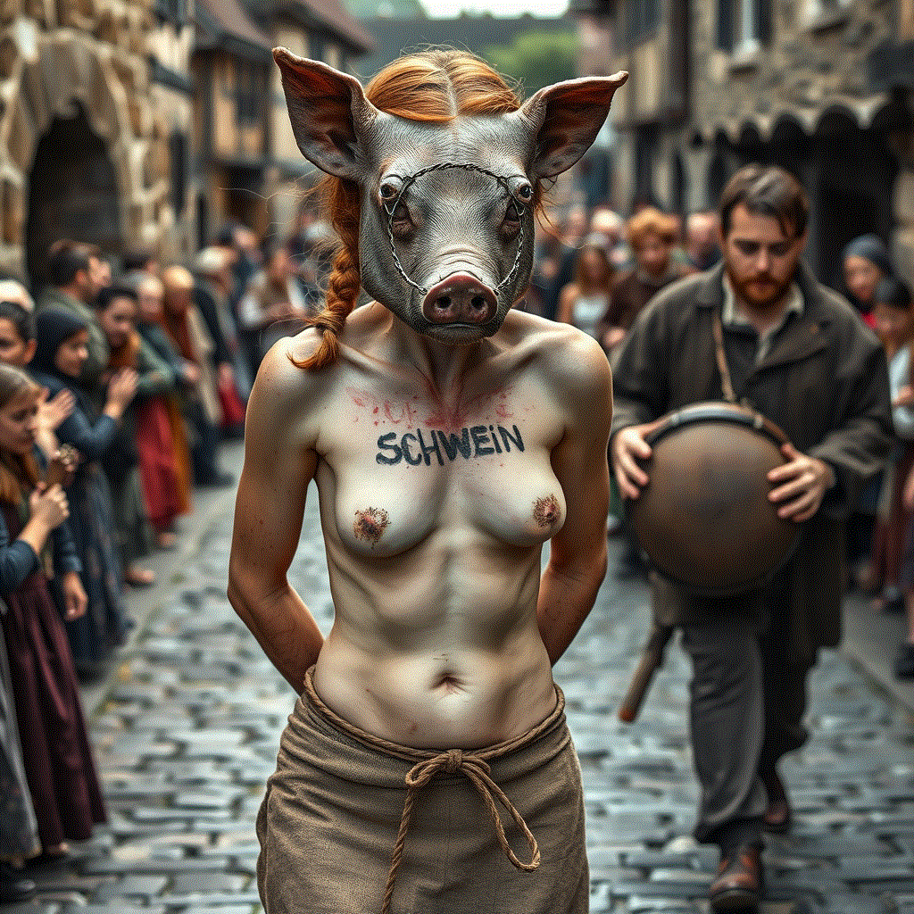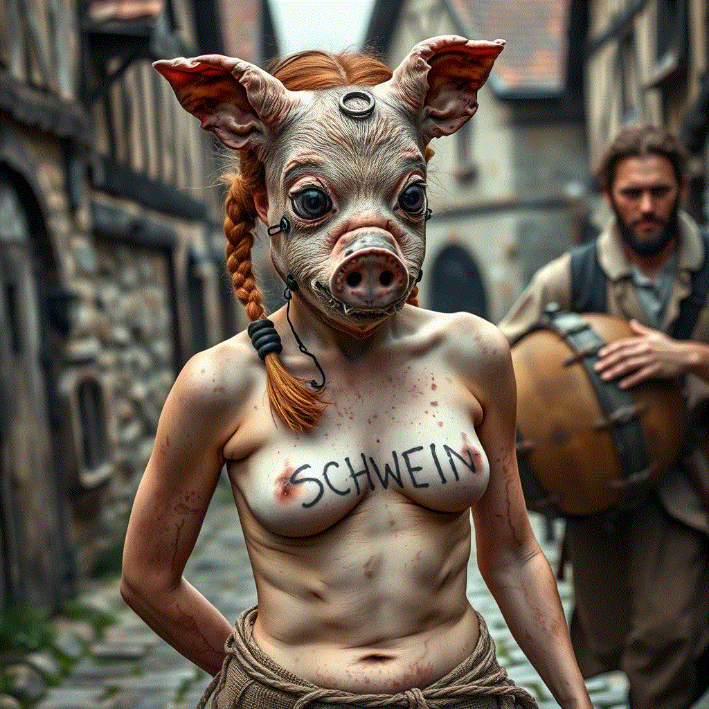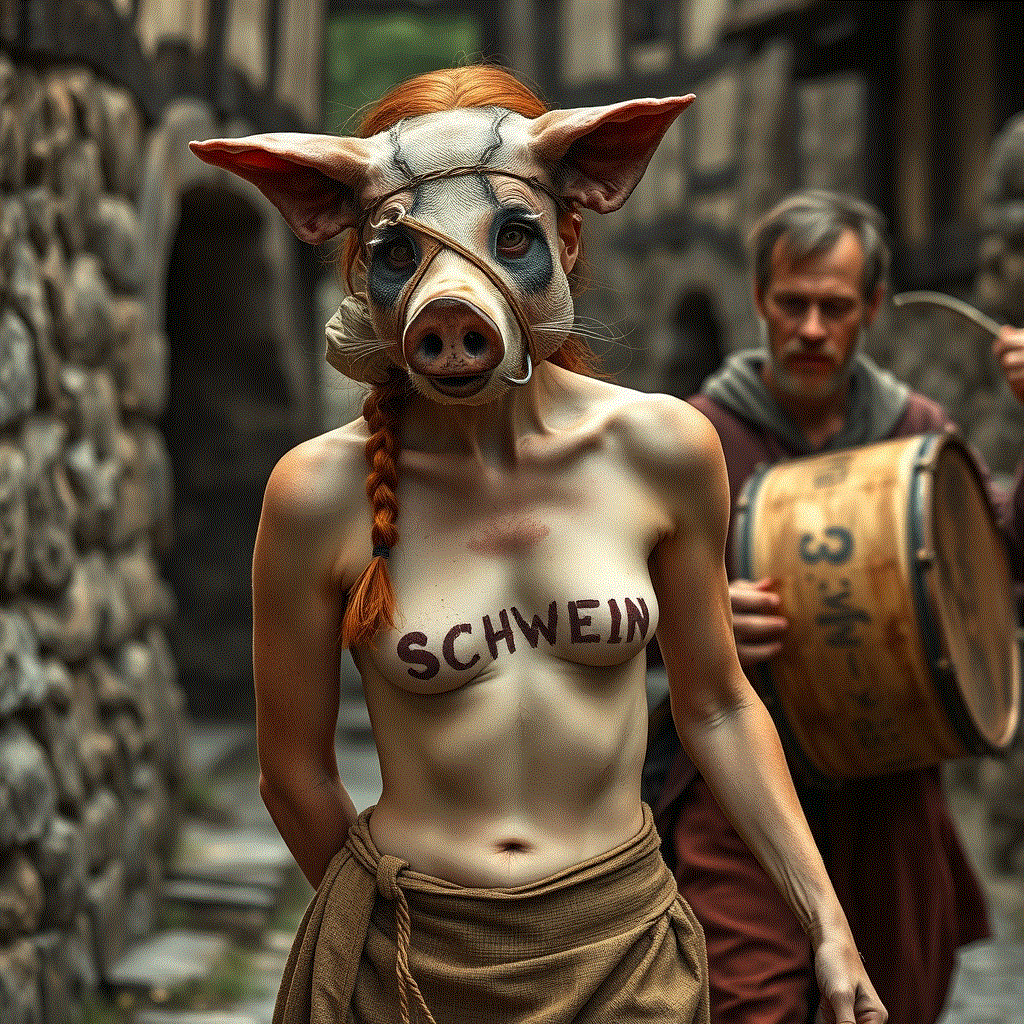 Convicted of being swinish or pig like the Shwein Frau would be forced to wear the face of a pig, the skin cut from a slaughtered swine and stretched over her own visage. The stinking, rotting mask encases her head. She stumbles along clumsily, peering out through the eye holes. Her arms are bound behind her back. Her jeering neighbors drive her along with willow switches and bunches of brambles.