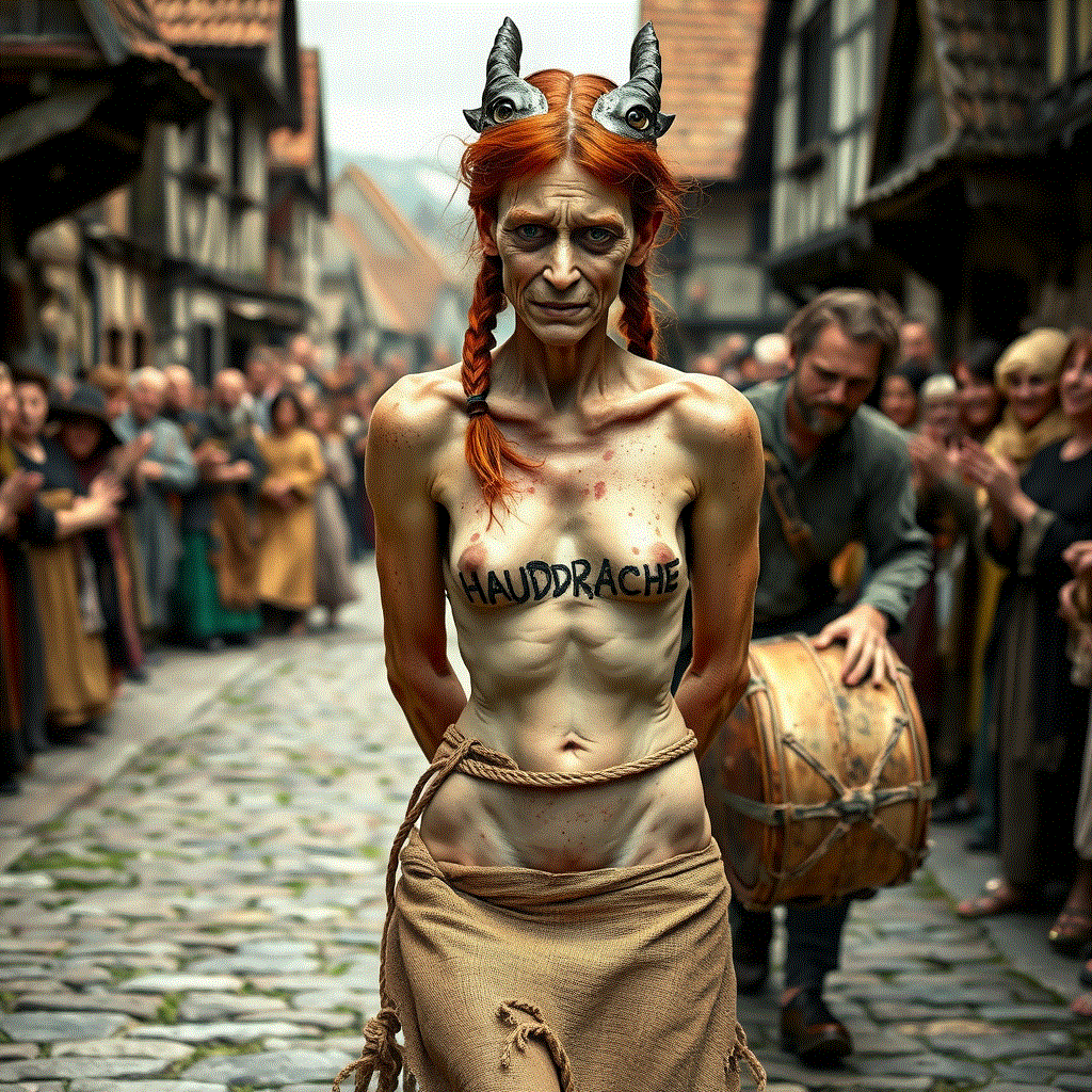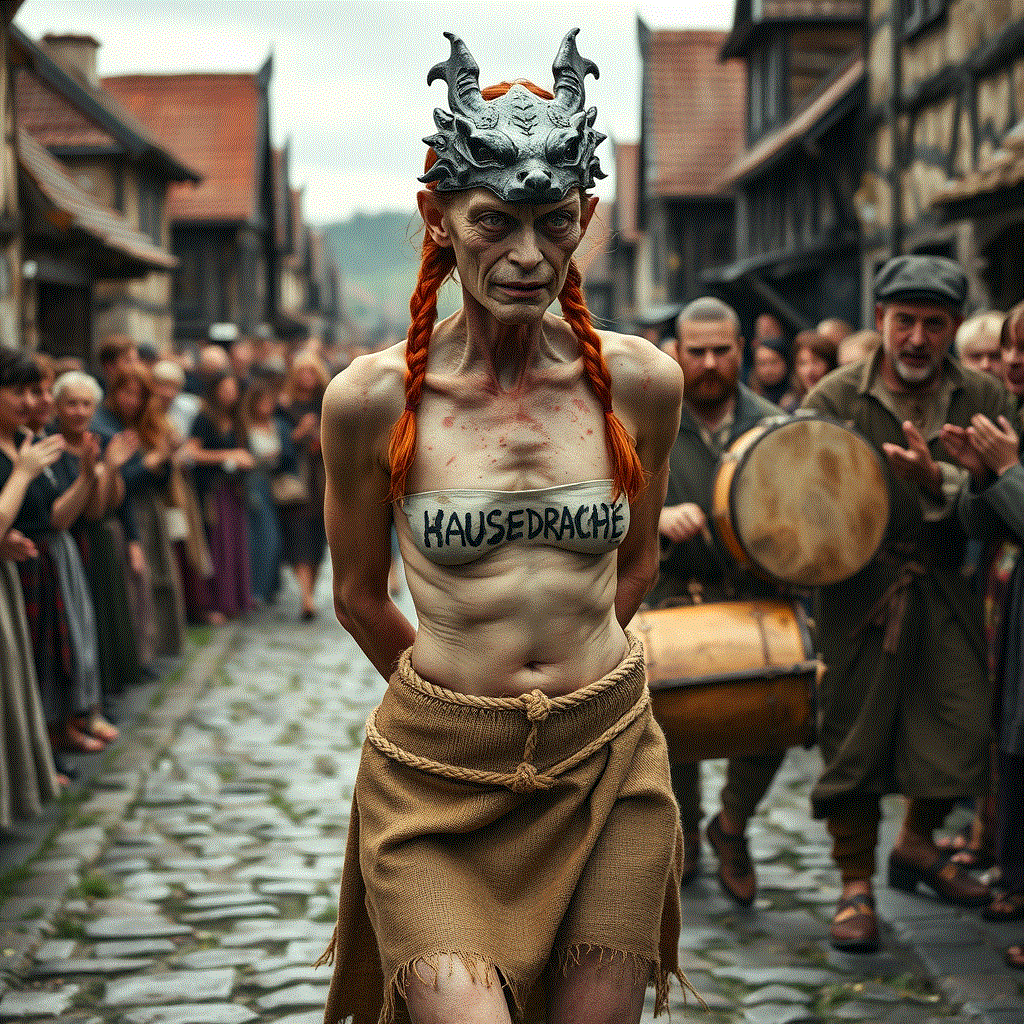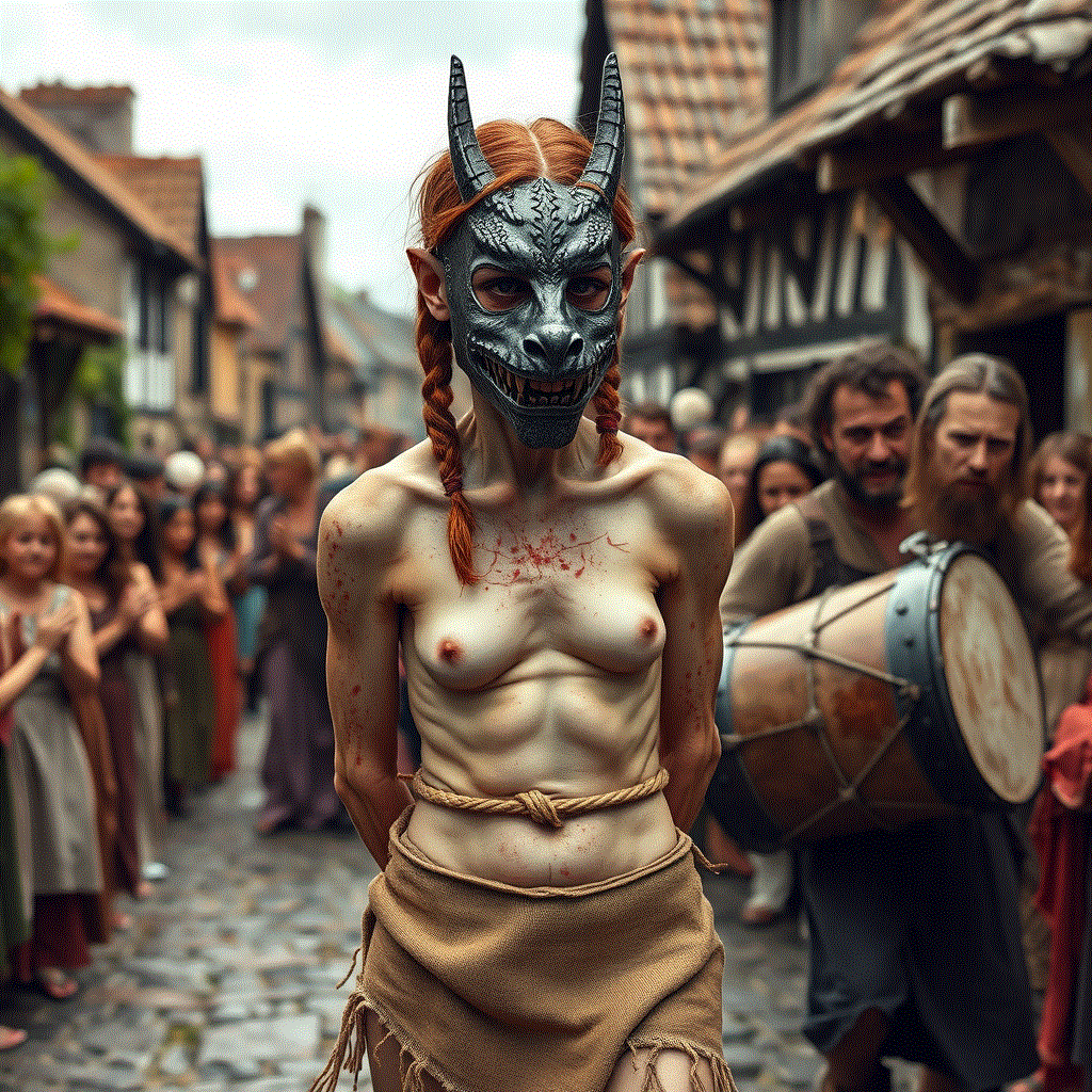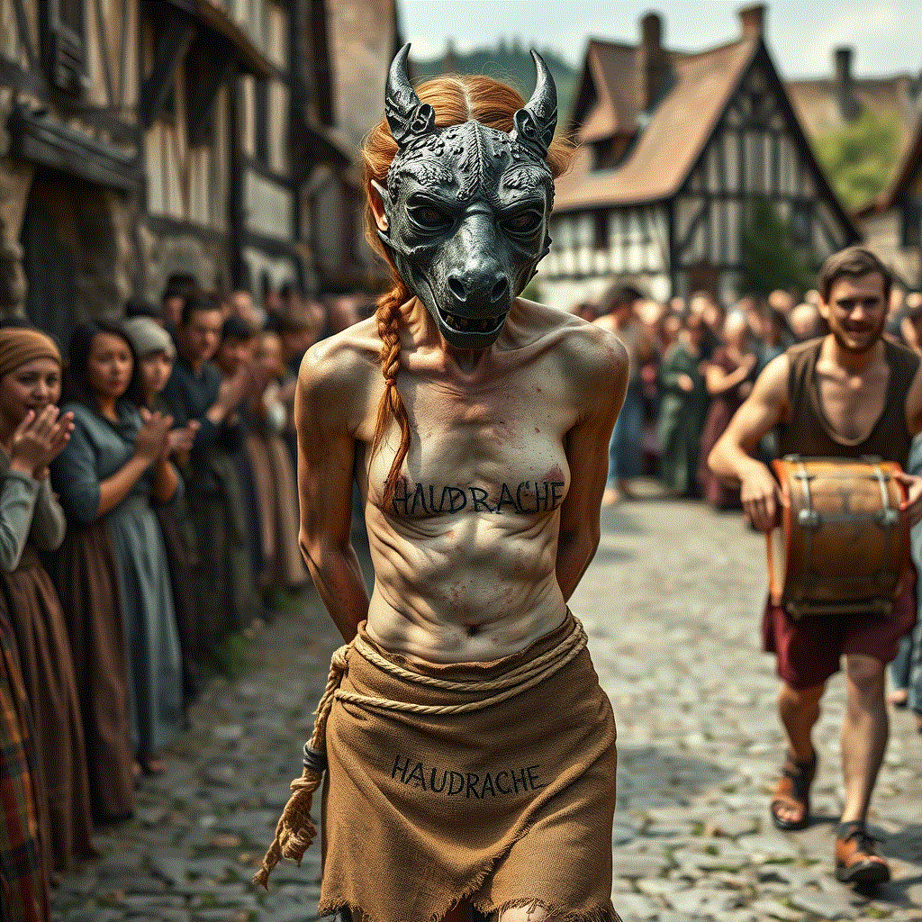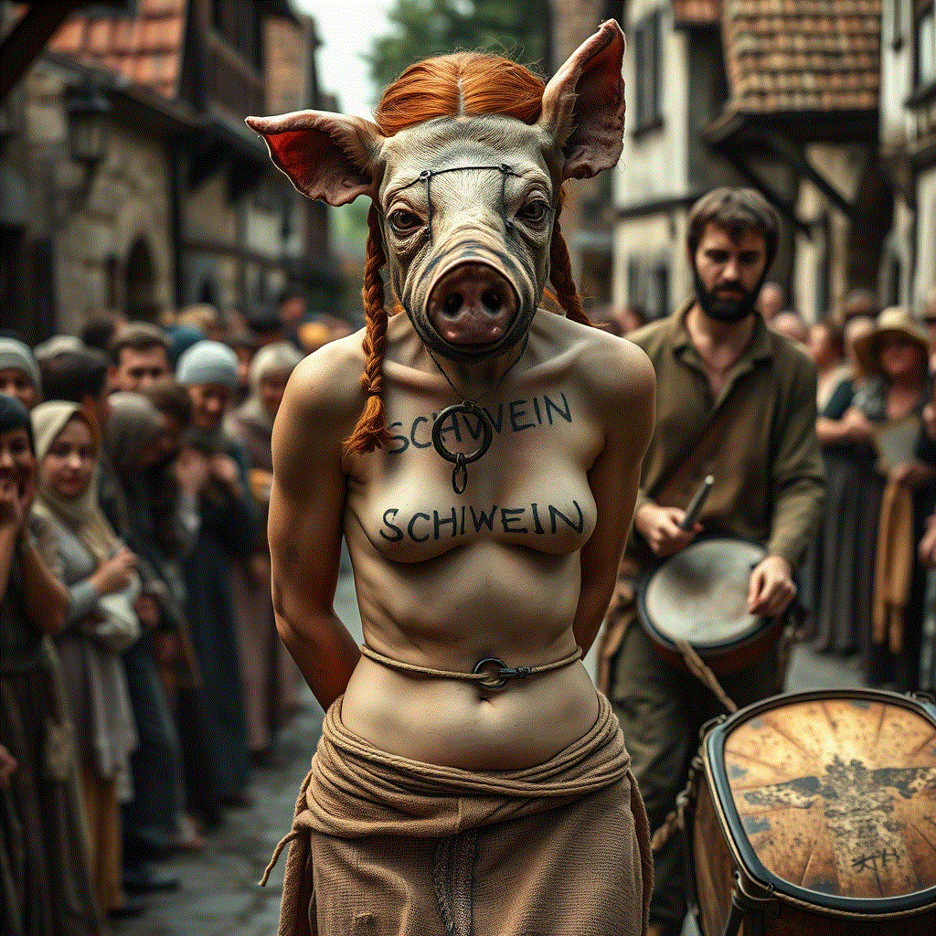 Convicted of being swinish or pig like the Shwein Frau would be forced to wear the face of a pig, the skin cut from a slaughtered swine and stretched over her own visage. The stinking, rotting mask encases her head. She stumbles along clumsily, peering out through the eye holes. Her arms are bound behind her back. Her jeering neighbors drive her along with willow switches and bunches of brambles.