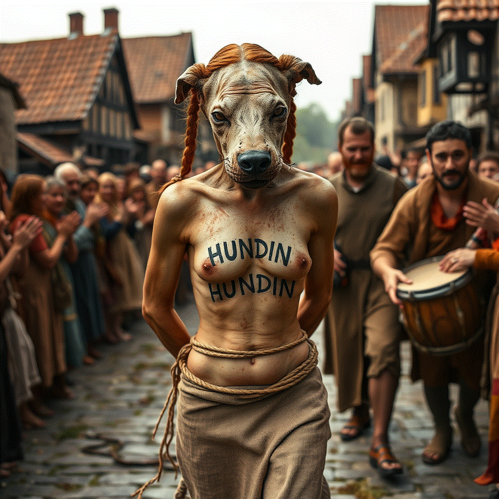 She has the nature of a dog, perhaps a bitch in heat. Now her face is encased in the rotting flesh, cut from the head of a stray dog. Her neighbors chant "HUNDIN, HUNDIN, HUNDIN, DRECKIGE HUNDIN"