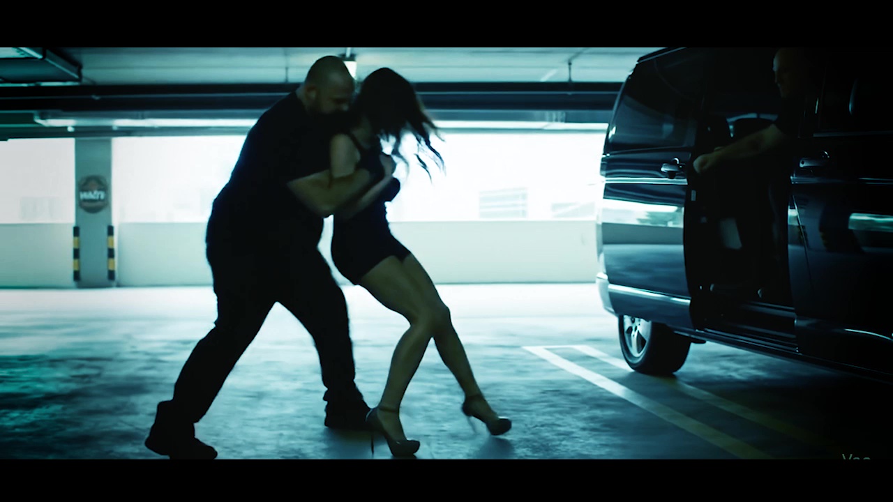 A stunning young woman has been kidnapped in a parking garage by two men.