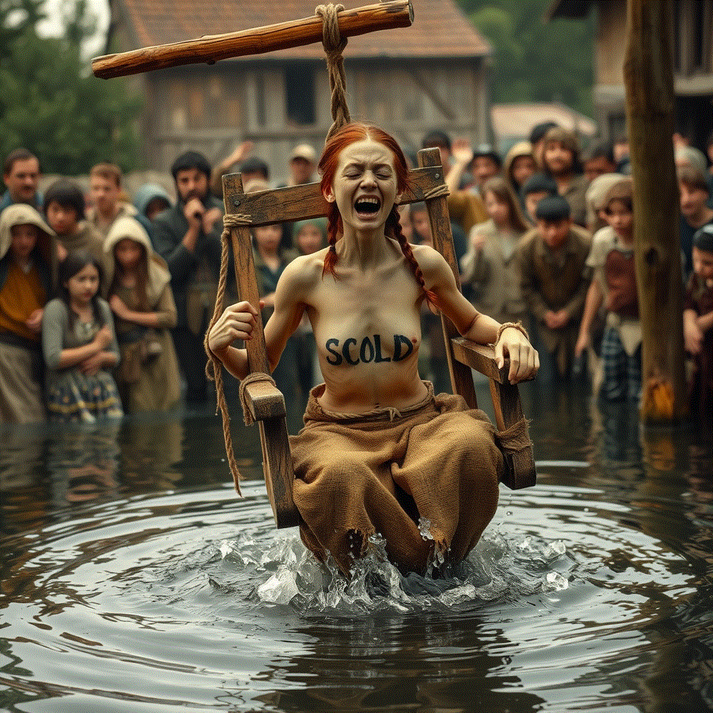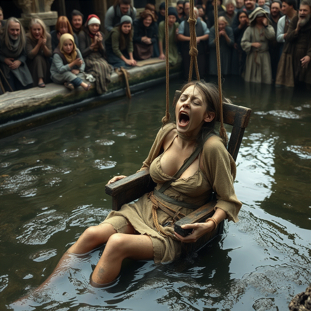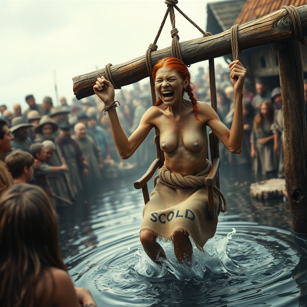 Sentenced to the Ducking Stool in mid winter she shivers as she is plunged into icy water, then held dangling in the frigid breeze.
