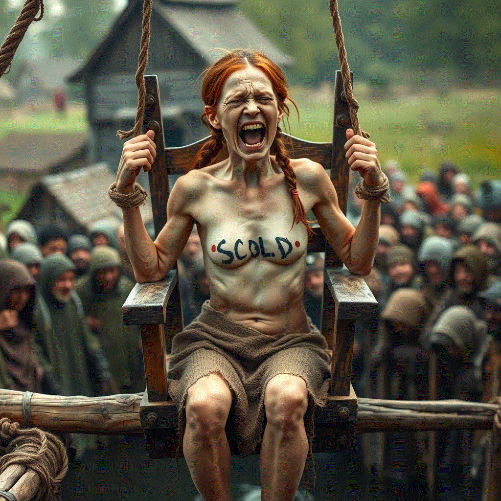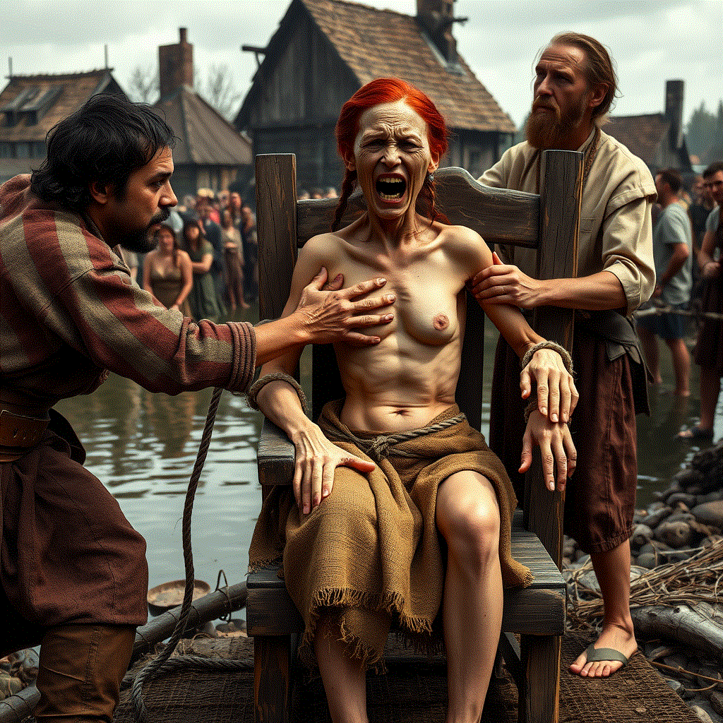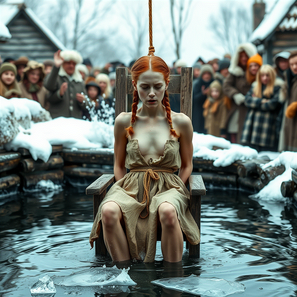 Sentenced to the Ducking Stool in mid winter she shivers as she is plunged into icy water, then held dangling in the frigid breeze.