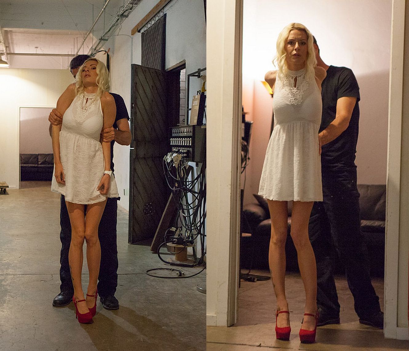 The gimp is brutally led (or carried ?) to the torture chamber by her hair:
