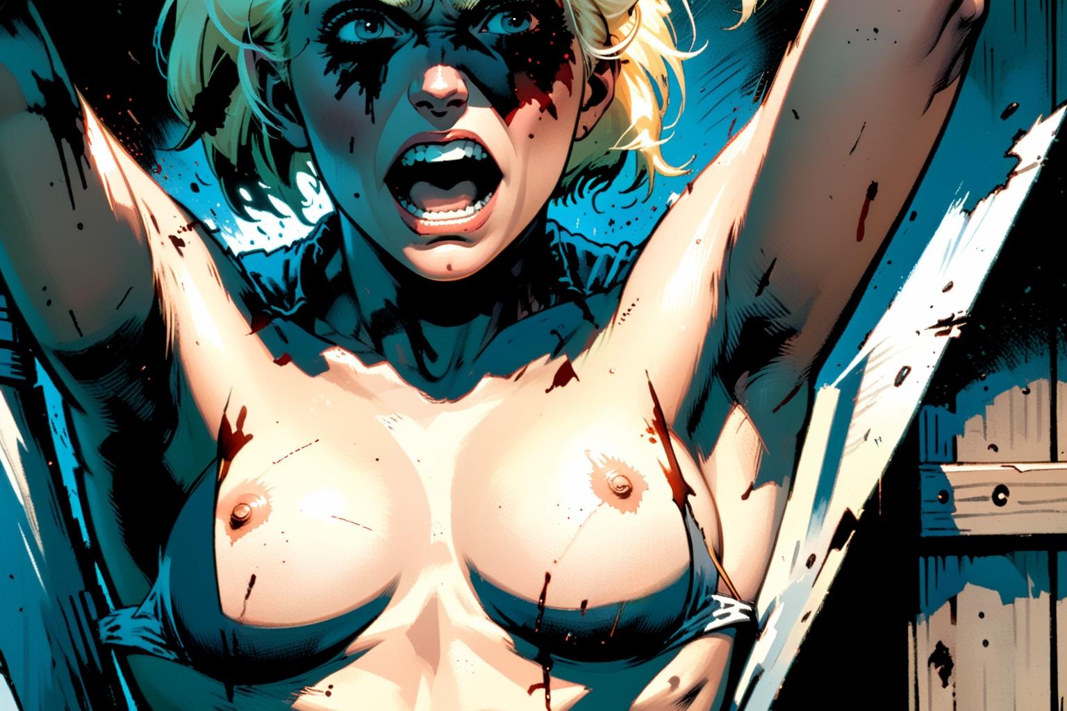 Female cop on left, lipstick off, beaten and cigarette burned face in interrogation, (photorealistic).