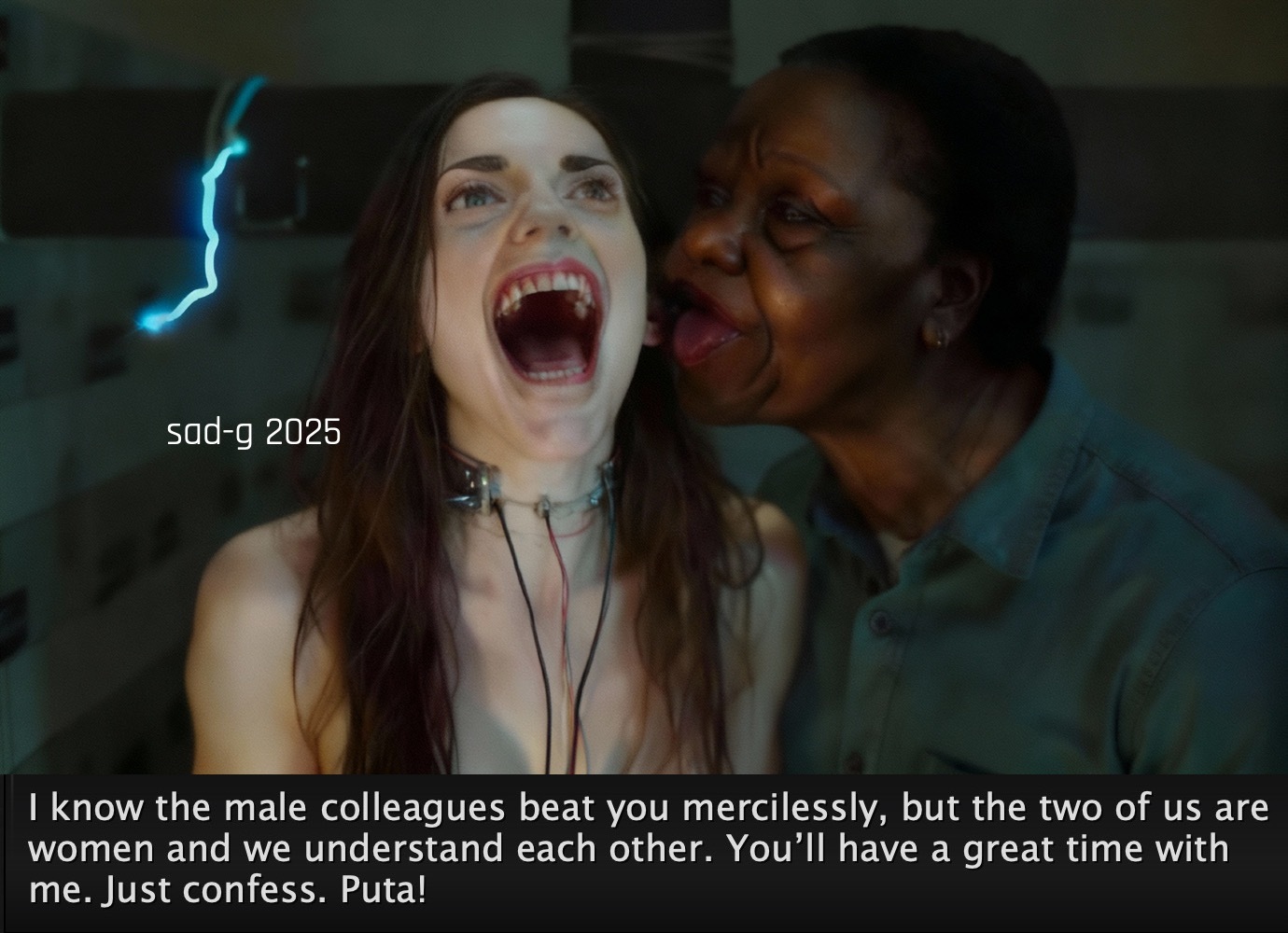 Someone messaged me privately, a bit bothered, asking why the torturers have lately been Black and the girls very pale. So I feel obliged to clarify this here in the thread as well, since there’s no political correctness in the dark things we’re doing here. It’s simply that this color contrast dominates in my personal fantasies — obviously it has nothing to do with racism. In the fictional Central American island of San Rosario, there is racial diversity. I try to create images that primarily satisfy my own imagination; I just hope some of them appeal to others as well.