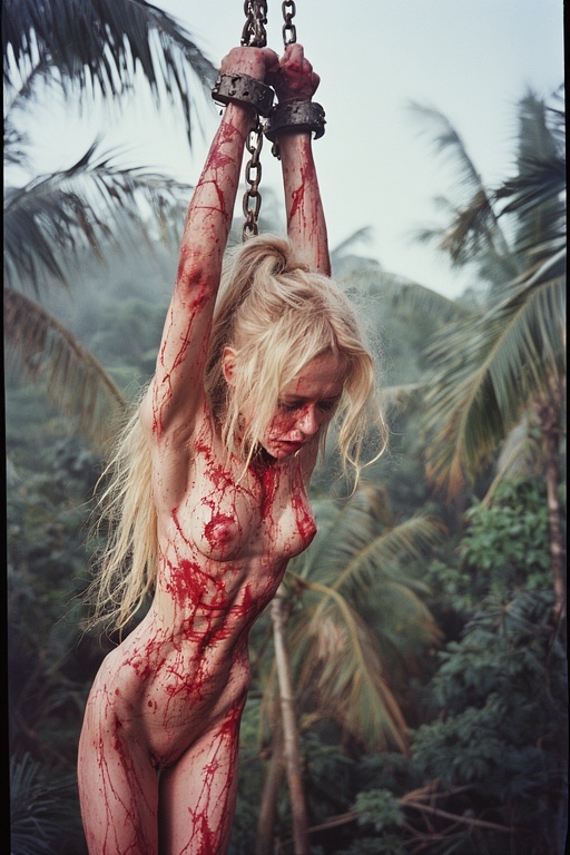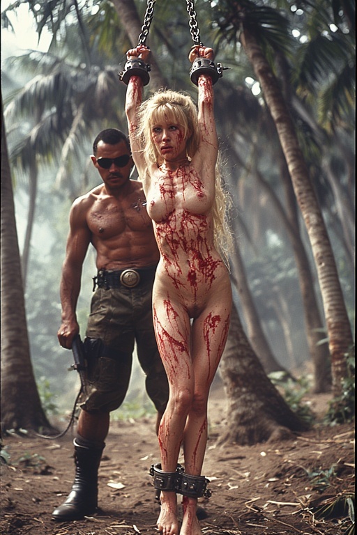 Another soldier stepped forward, younger, eager. "My turn!" he shouted, swinging the strap in a wide, practiced arc. It snapped against her ribs. Camryn cried out, a raw, involuntary sound. The men roared approval. They treated it like sport, jostling for position, placing bets on who could draw the loudest scream or the most blood. "Aim lower!" one yelled. "Make her dance!" The next lash coiled around her thigh, the tip biting deep. Blood welled instantly, trickling down her leg. She squeezed her eyes shut, trying to retreat into the fractured sanctuary of her mind. But the pain was relentless, a physical invasion that shattered any mental escape. Each strike was a fresh agony, mapping her skin with fiery welts and weeping cuts. The soldiers' enjoyment was palpable – their shouts, their laughter, the sheer athletic exertion they poured into inflicting torment. It was a grotesque competition fueled by cruelty, each man striving to outperform the last in the artistry of her suffering.