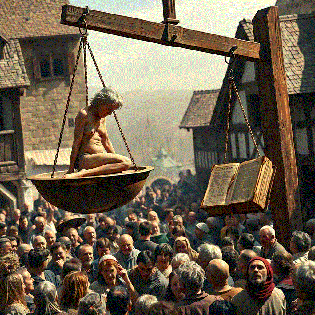 High above the murmuring crowd, the scale loomed like a skeletal giant. Its immense wooden beam, warped by years of sun and rain, stretched between two thick posts, ready to weigh sacks of grain, fat hogs, and today, a human soul. Elara stood before it, frail and exposed even in her coarse shift. Reverend Mother Agnes, a woman of severe rectitude, and Father Thomas, his face a mask of pious condemnation, stood beside the scale, their figures imposing against the grey sky.