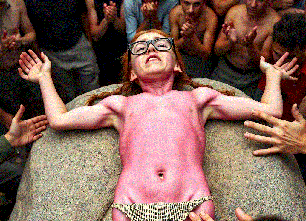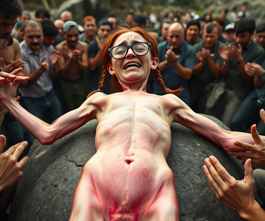 They stretched her out on her back on the stone and stretched her arms and legs, tying them to two stakes. Her back was arched and her belly stretched tight as the head of a drum
