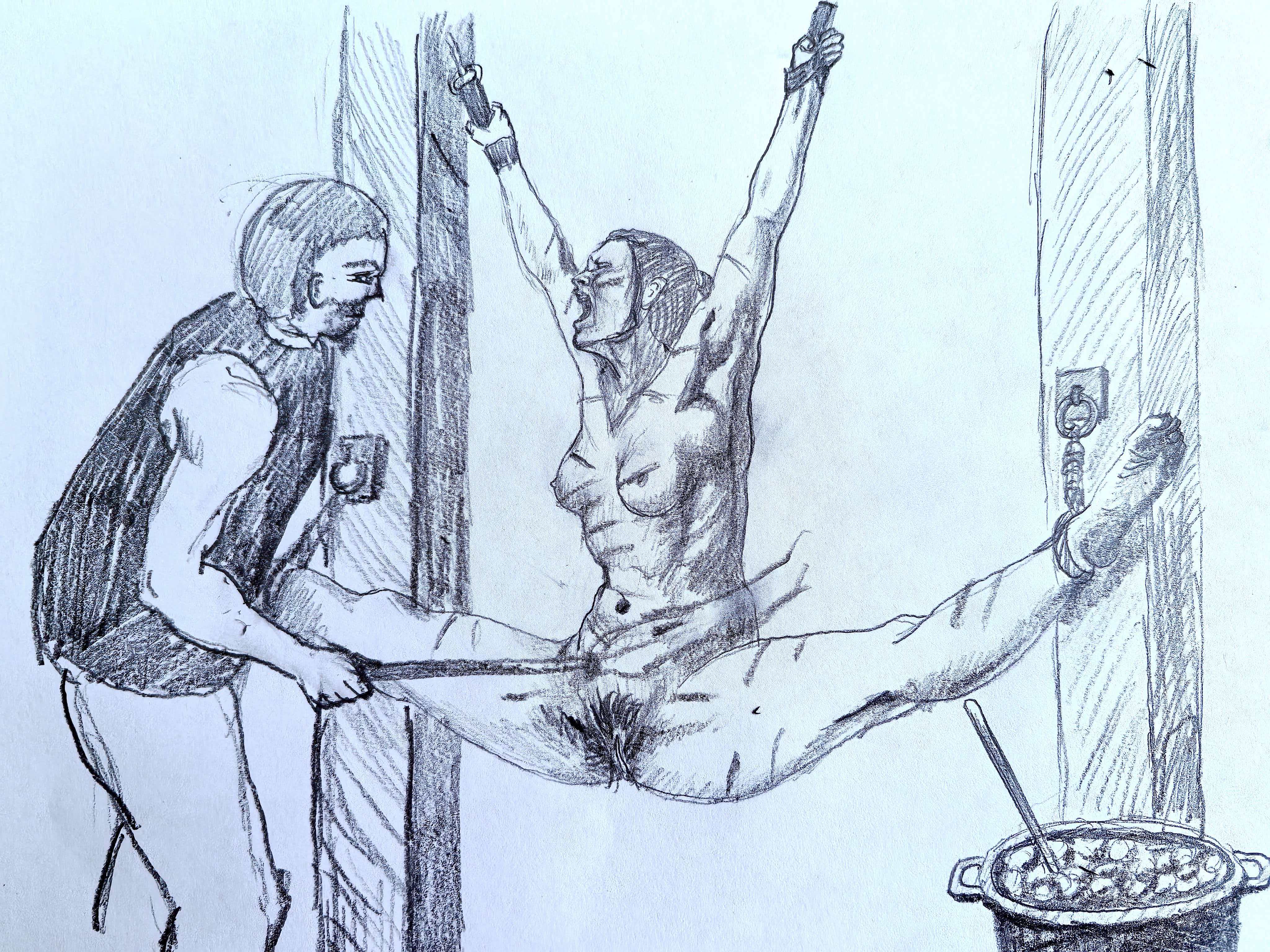 I love her position in this one. It's painfully stressful but allows enough movement to be able to really enjoy her struggles as she's burned. An excellent piece of work, and thanks for sharing.