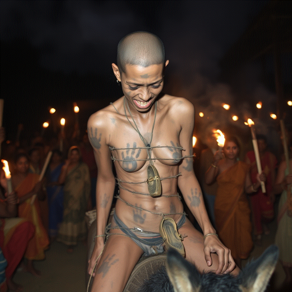 A low caste woman is accused of witchcraft. The court of village elders convict her. She is stripped naked. Her body is smeared with charcoal. Her hair is tonsured. A necklace of old shoes is hung around her neck. Then she is paraded through the entire district on the back of a donkey. The villagers beat her with sticks along the way. Finally she is left hanging by her wrists from a tree. She will stay there until someone takes pity on her and cuts her down.