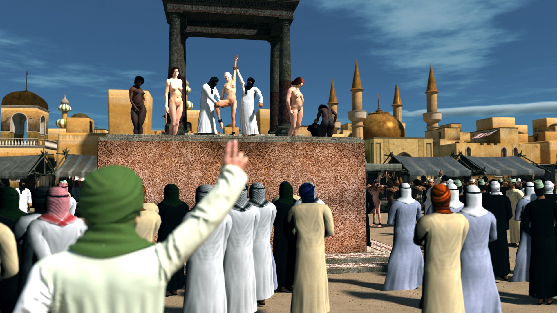 Slave buyers are reluctant on buying white slaves as they are feeble workers so the last attempt is made to sell all of the three white sorceresses at one bargain price. Finally, the local baker agreed to pay the meager amount. He just lost a couple of well-muscled wheel-turning Nubians to the plague and now he's short a few slaves to keep the mill running. "At least if they die spinning the wheel, I didn't pay a fortune".