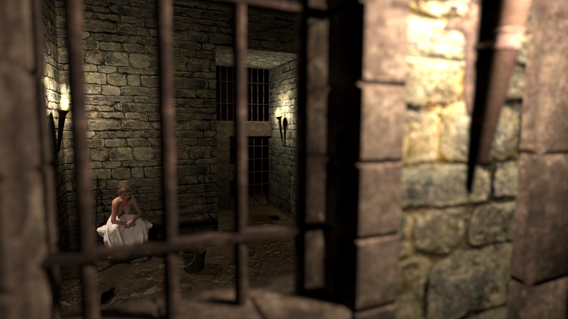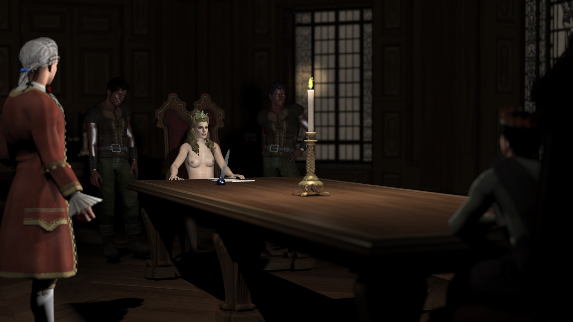Anna Henrietta and her enraged husband, the Duke. Dragged naked from the bedroom, she's given an ultimatum, give up all her hereditary rights and live in seclusion or visit the dungeon. Two of the dungeon guards were called in the room to stress the seriousness of it. Anna was sure her husband was only bluffing and she decided to call his bluff.