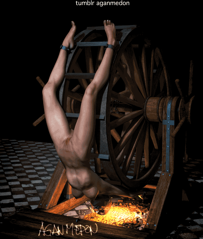 The contraption she's on will provide a good torturous arching stretch, and her legs, anchored to the wood posts, will be pulled apart by the coming stretch, for...?