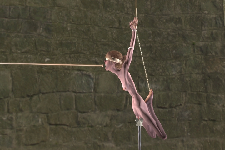 A noose is around the neck of the traitor, which can be tightened from time to time by its electric winch, to cut off her air completely for seconds or a minute or so (whilst still being shocked and beaten). All the winches are under the control of another interrogator who is well trained in ensuring the subject is stretched to a suitable tension, thus maximising the pain and stretching her chest, increasing the difficulty in breathing. The interrogator also controls when, how long, and how intense the shocks are to the vagina or anus...or across the two. She also controls the shock level for the probe when that is selected to be used.