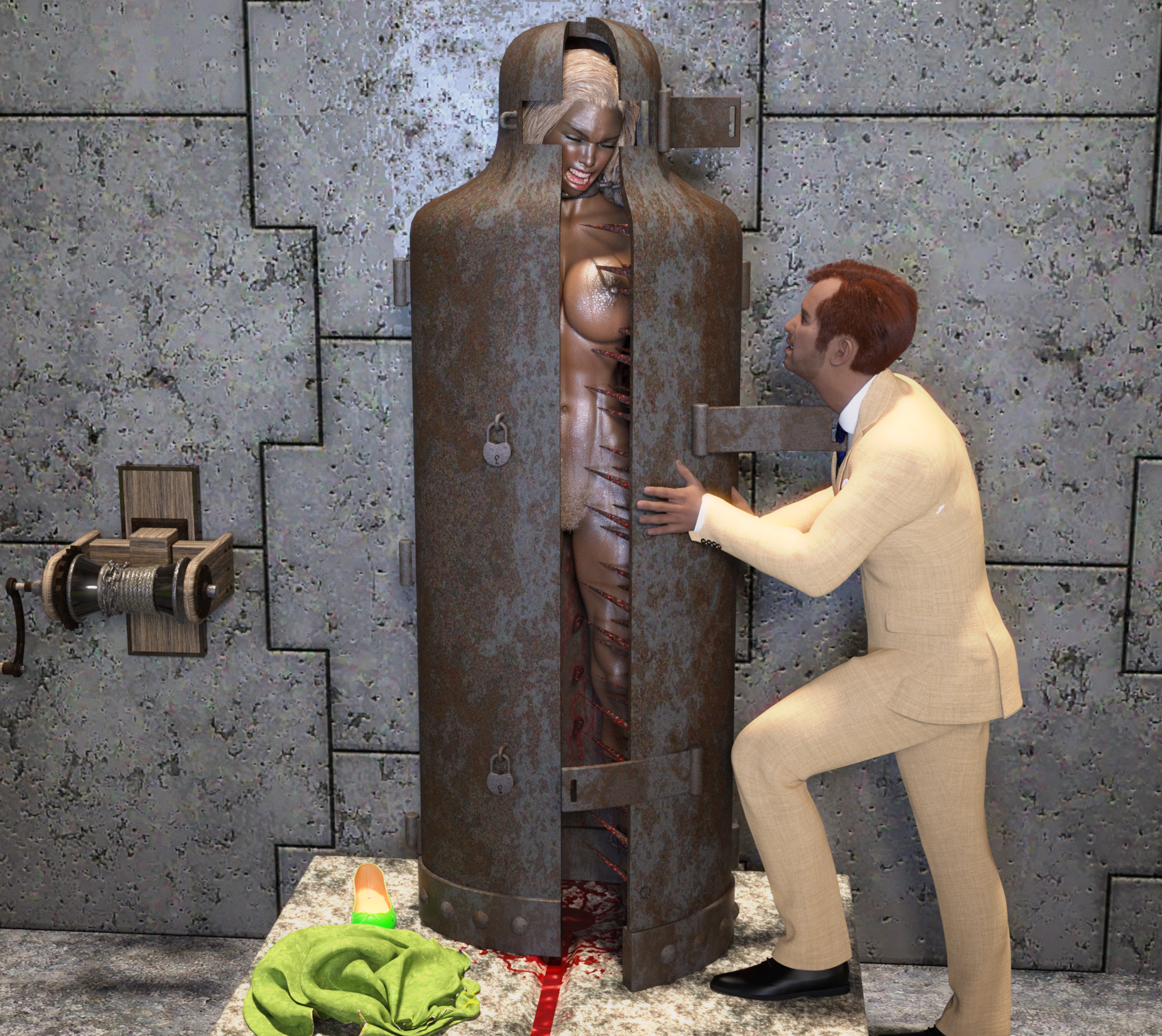 "There you go, my dear. Can't really say anything, can you? I imagine it really hurts to try to inflate your lungs with all the spikes in your breasts and your chest! Anyway, enjoy yourself for the next few days--I've read that victims who get shut inside the Maiden usually last that long. One unfortunate lady lasted for a whole week! I wonder how long you'll last? Oh, you won't be by yourself all the time. I'll drop in now and again to see how you're doing and to give you some water and stimulants so you'll last longer and enjoy all the excitement associated with this marvelous device! But bye for now. I have guests to entertain upstairs!"