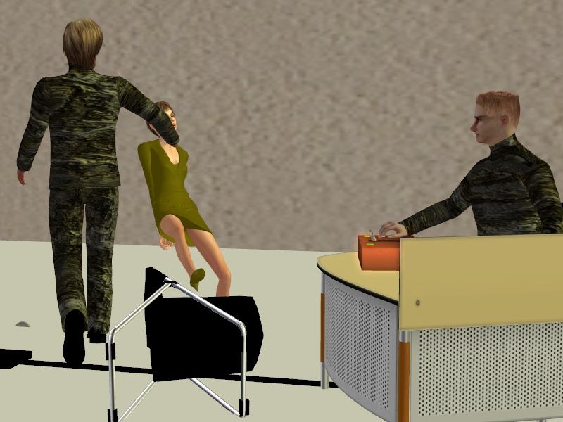 The other interrogator looks on as pain racks her fragile body. The other contemplates when to change the shocks to a different sensitive area.
