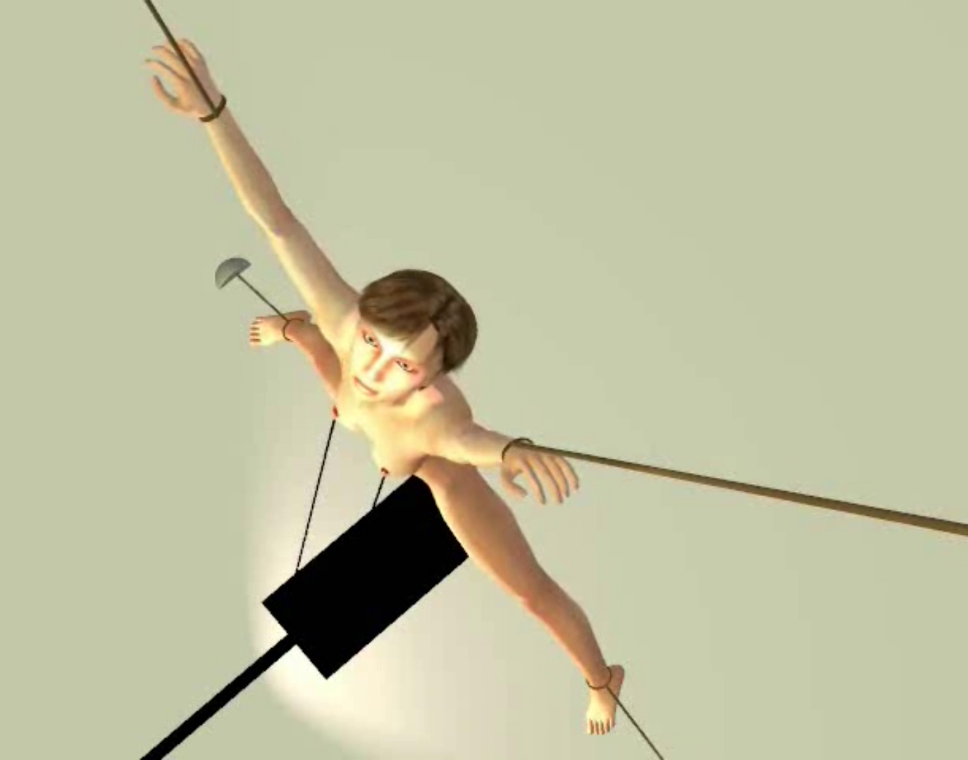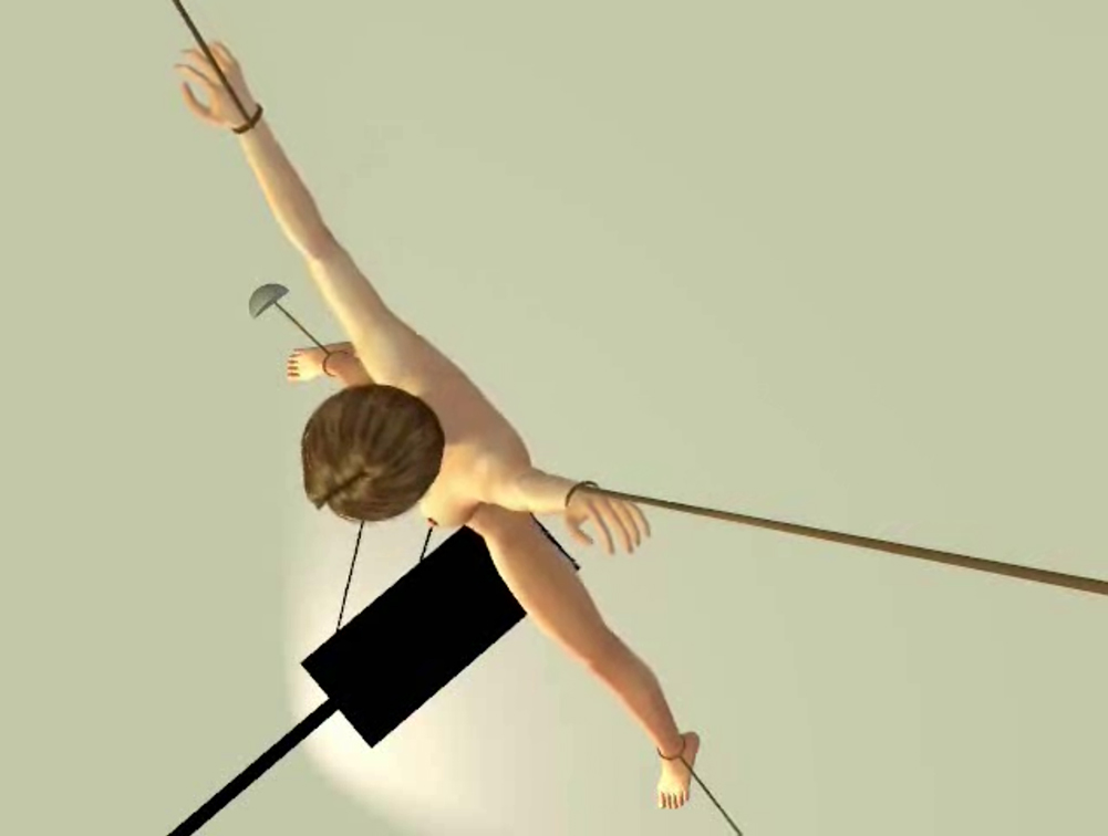 Just stretched out like that is painful and makes it hard to breathe. The muscles in her arms and legs are on fire from the strain. Unfortunately for her, there is more to come. She is completely at their mercy.