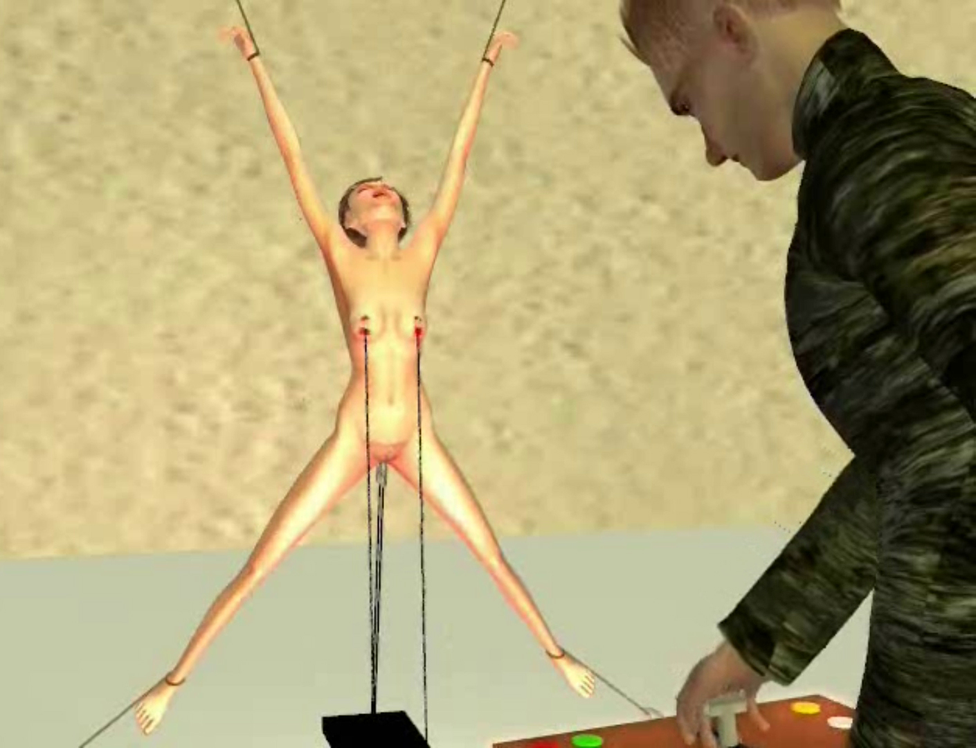 The other torturer, who has been enjoying the spectacle of her naked body lurching to their tune, is going to see if she is ready to talk.