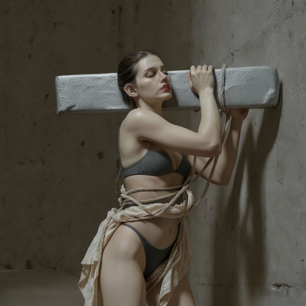 Thanks for the remark! The idea is that the torture consists of her holding the weight on her shoulder and her back, without using her hands to support it. From the pain, her arms are uncontrolled. But you are right, it's not a good pic, technically. Here is an alternative version with the same theme and a little chubby victim. The arms look natural here, IMO.