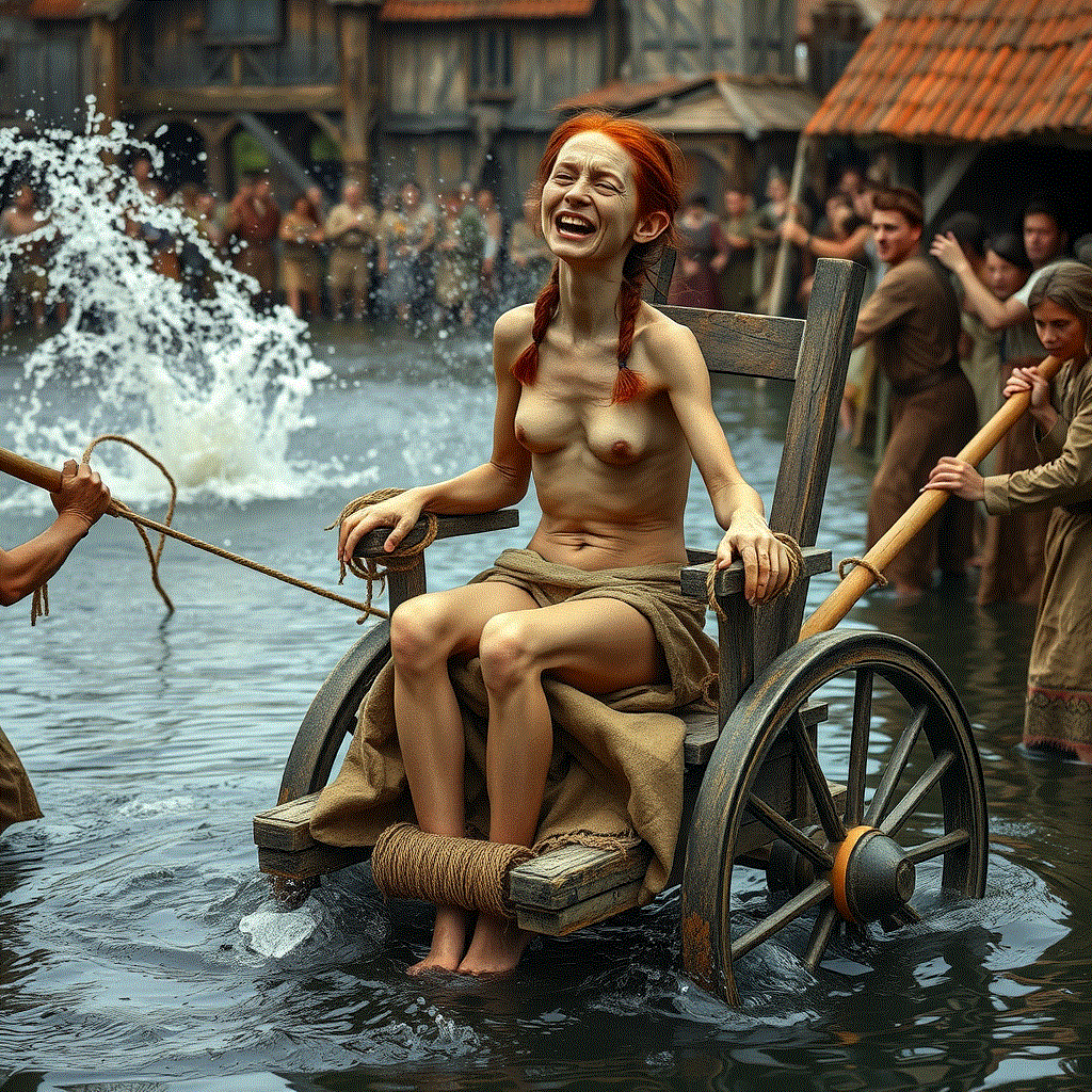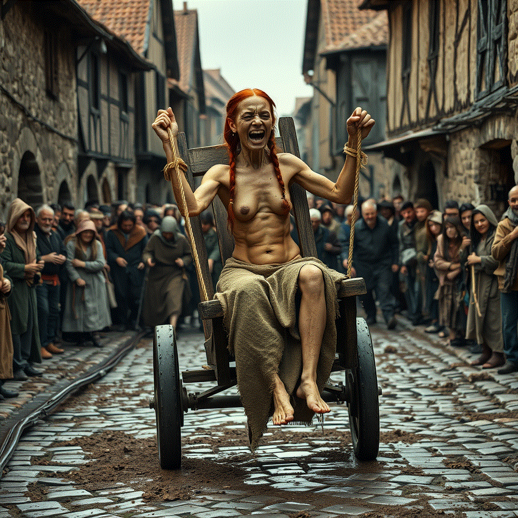 Bound tightly to the stool. The jeering mob wheels her though the streets.