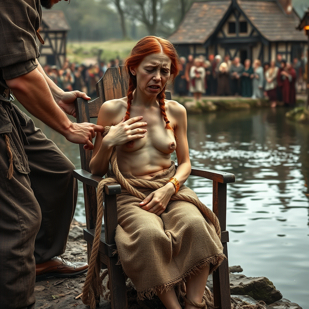 Her struggle to escape is all in vain. Bound tight she will be delivered to the none too tender mercies of the mob.