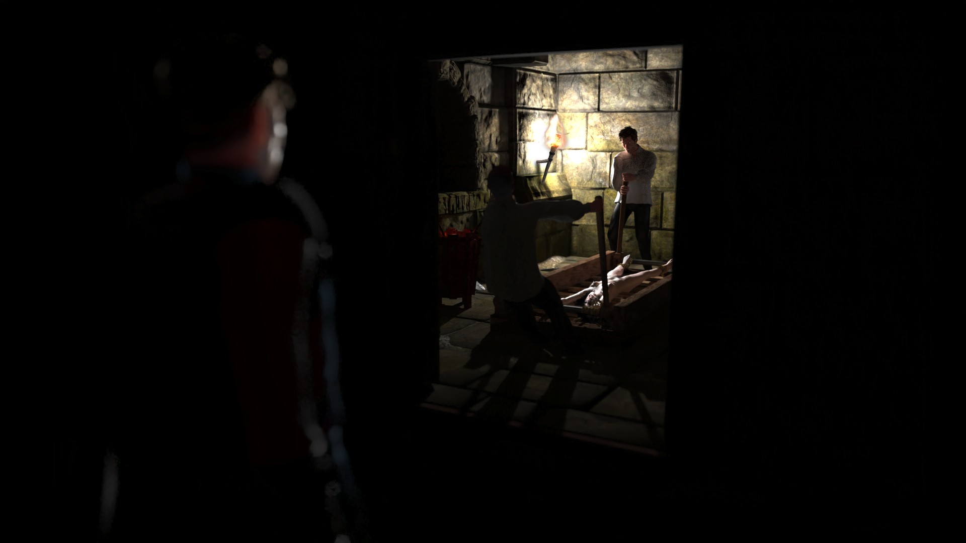 The poor girl can't walk anymore so a wooden stretcher is brought to carry her back to the cell.