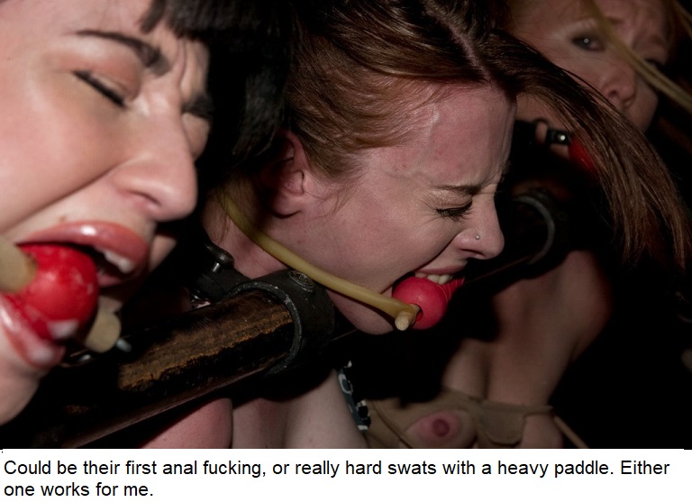 Setting aside their implements, the men kneel on the platform, to the sides of the pinioned girls so as not to obstruct the audience view, and begin to slowly fondle and grope the girls bodies. Not ignoring an inch of the smooth, helpless young flesh, the rough hands pay particular attention to sensitive breasts and nipples, vaginas and assholes...the first step in the young womens ordeal...