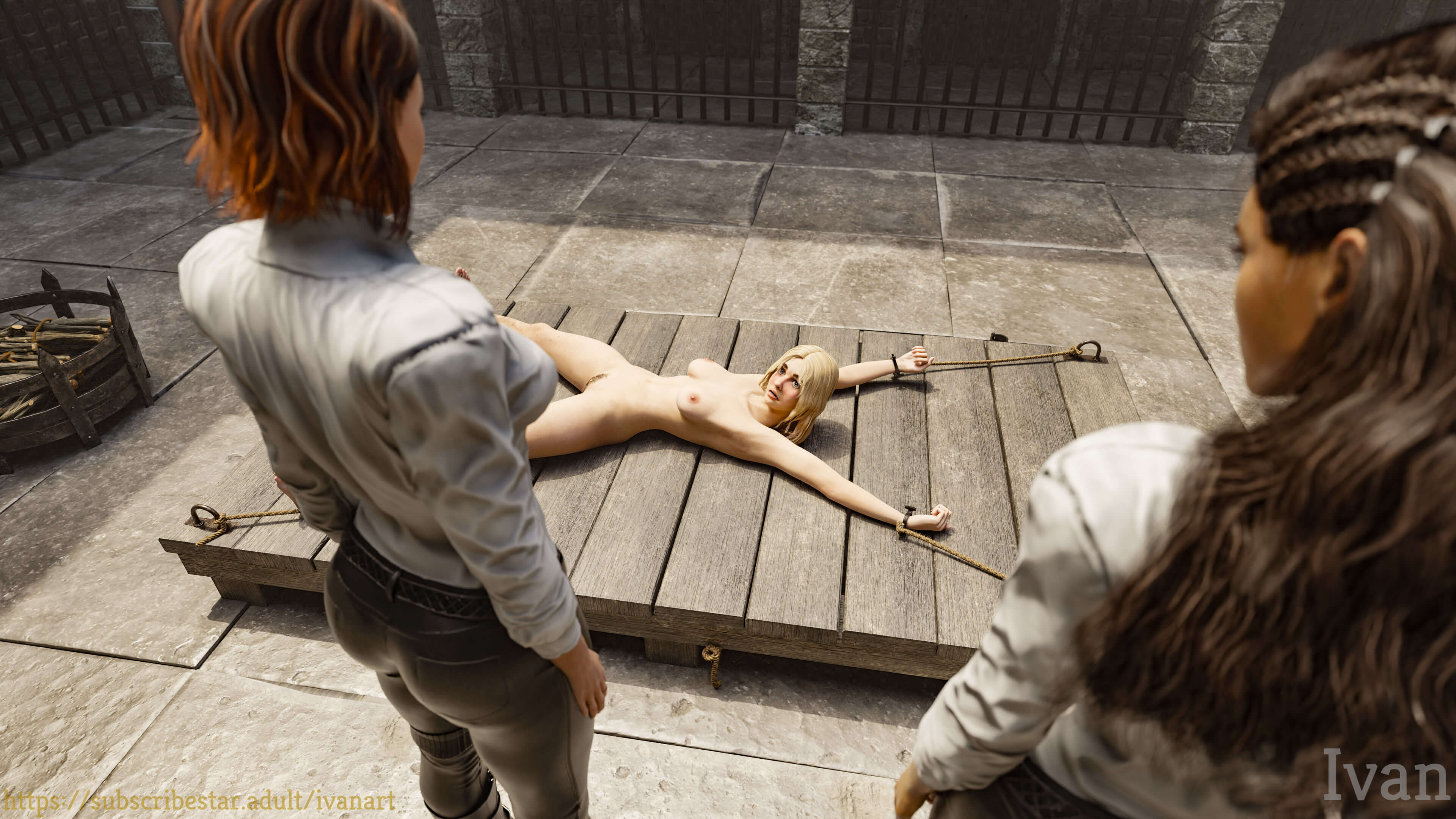 Working on a different form of impalement where the woman is tied horizontally then after the pole is inserted it is heated up. Here she is laying before the pole is added.