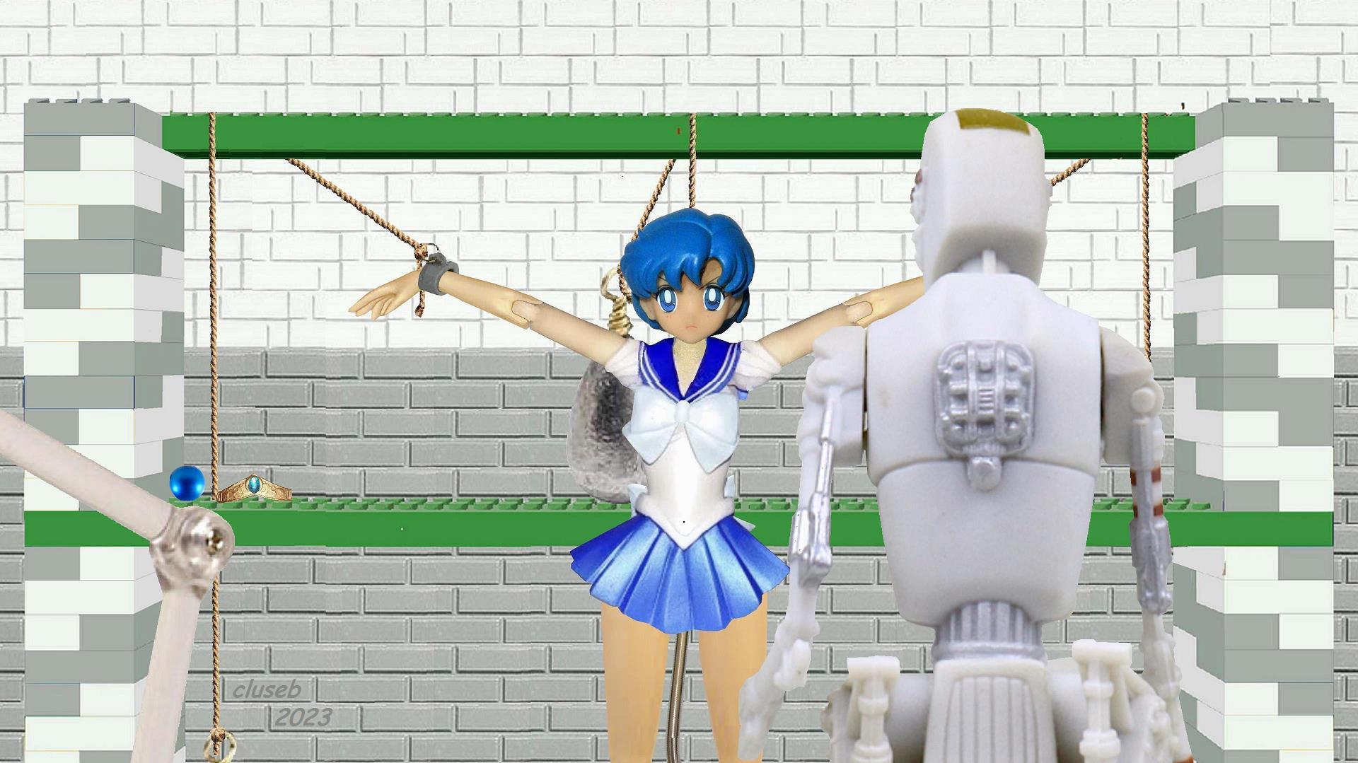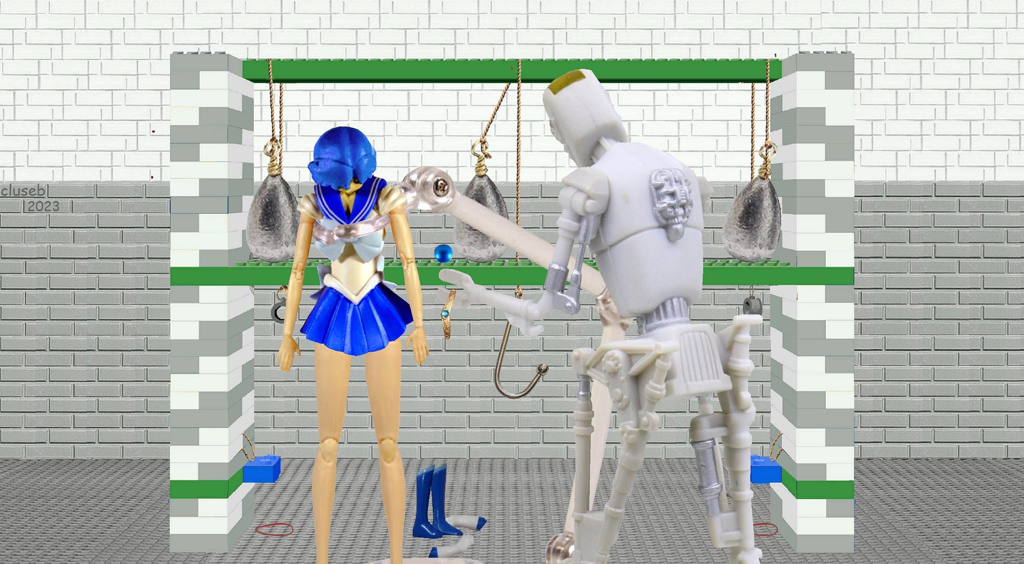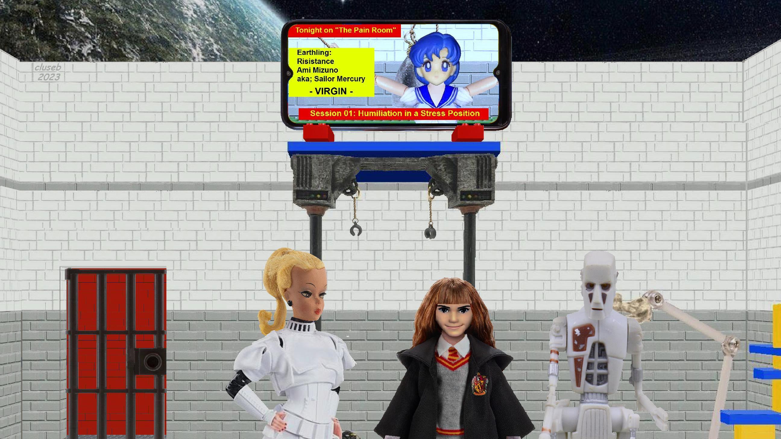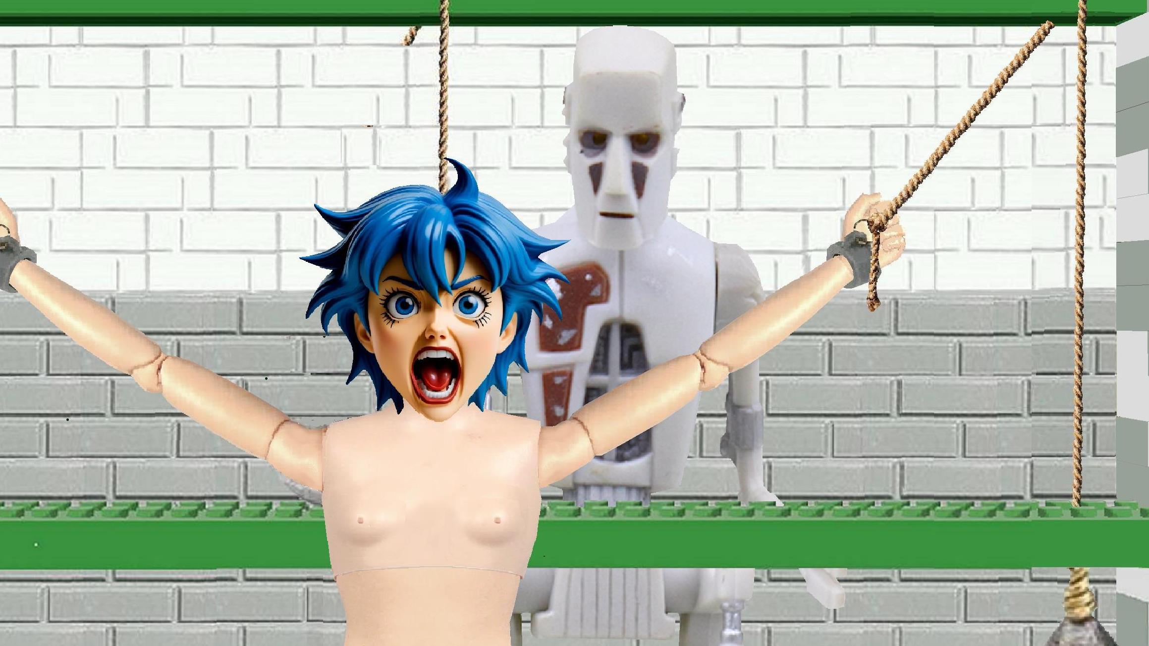 The trooper then stuck me in a giant action-figure-support-stand and walked away, a few minutes later a robot came over and started to undress me, how humiliating, a robot really, you'd think he'd want to do that himself, I mean I'm a pretty girl and he gets a robot to undress me, I thought, maybe he's gay.