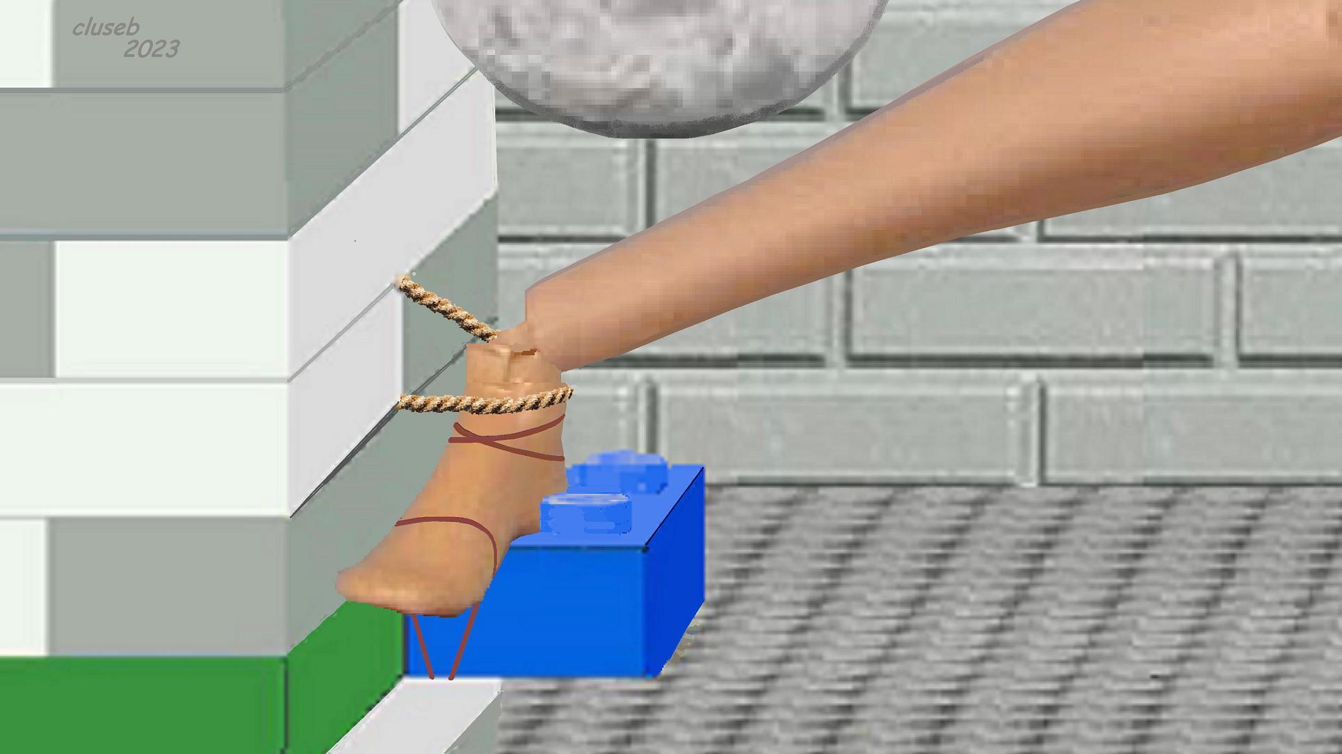 He grabbed my foot and pulled it over to the column to my right slipped it through a rope loop then wedged my heel between the column and a peg in the support and finally wrapped an elastic around it to affix it in place