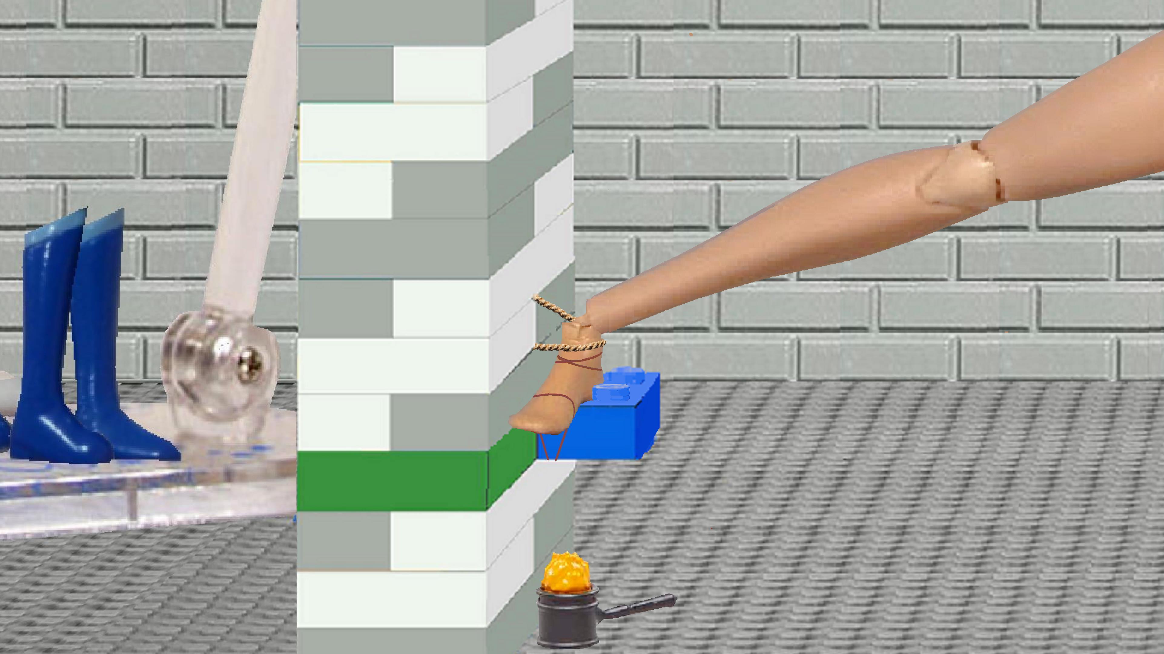 It gave up on the shirt and skirt and stood me up against what I thought was a shelf and put my wrists in shackles that were attached to weights which it then pushed off the shelf. They pulled my arms back and up, so this is the stress stand trooper-Barbie had referred to.
