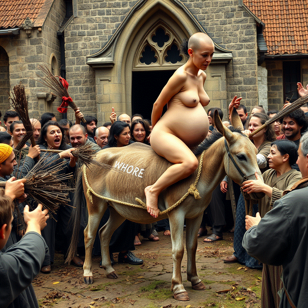 Her shaven skull and swollen belly exposed to mockery and jeers.