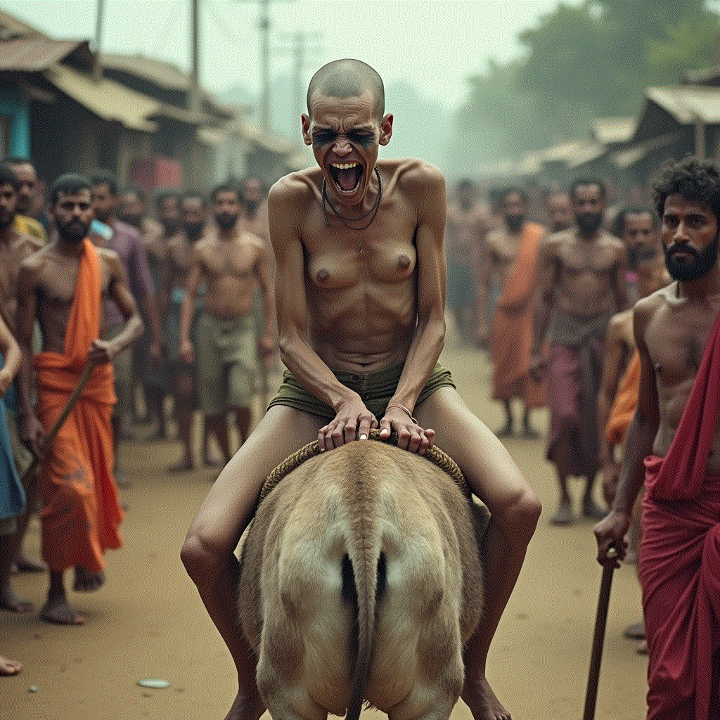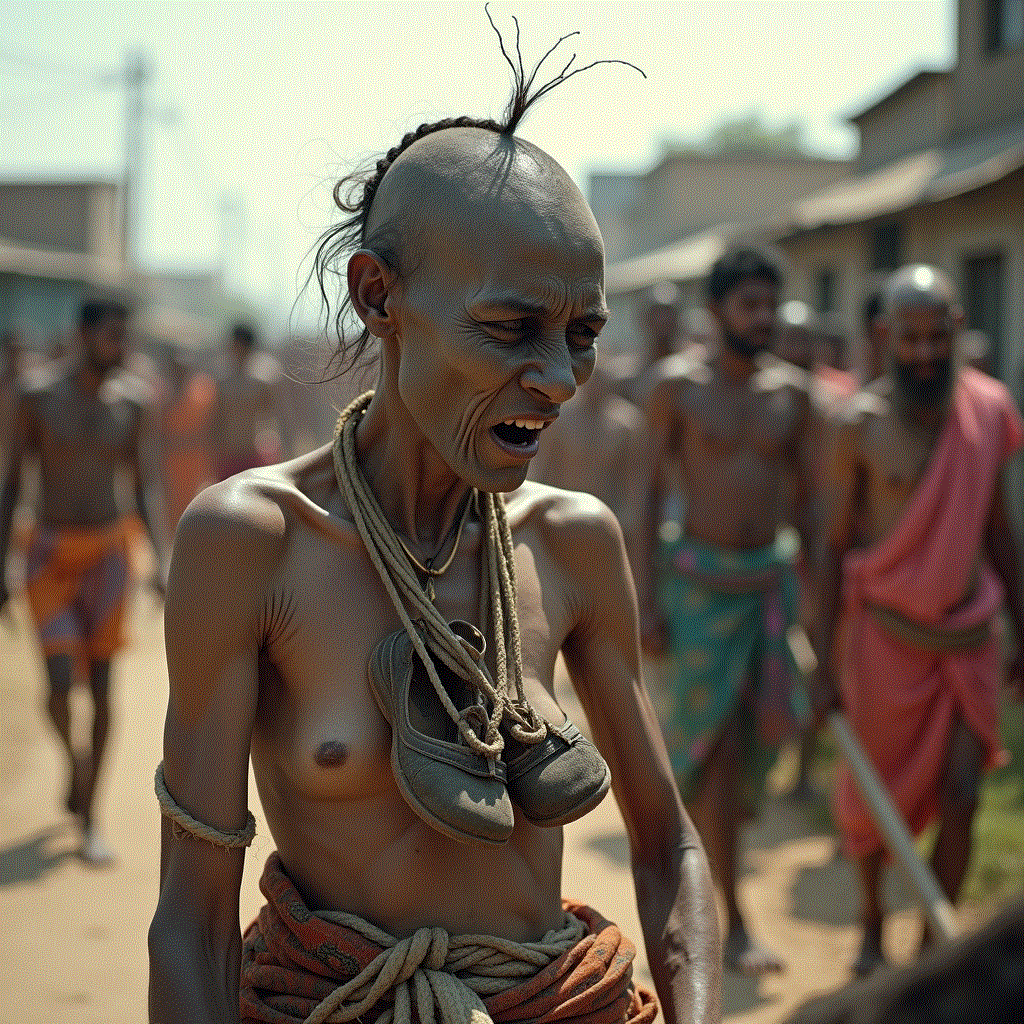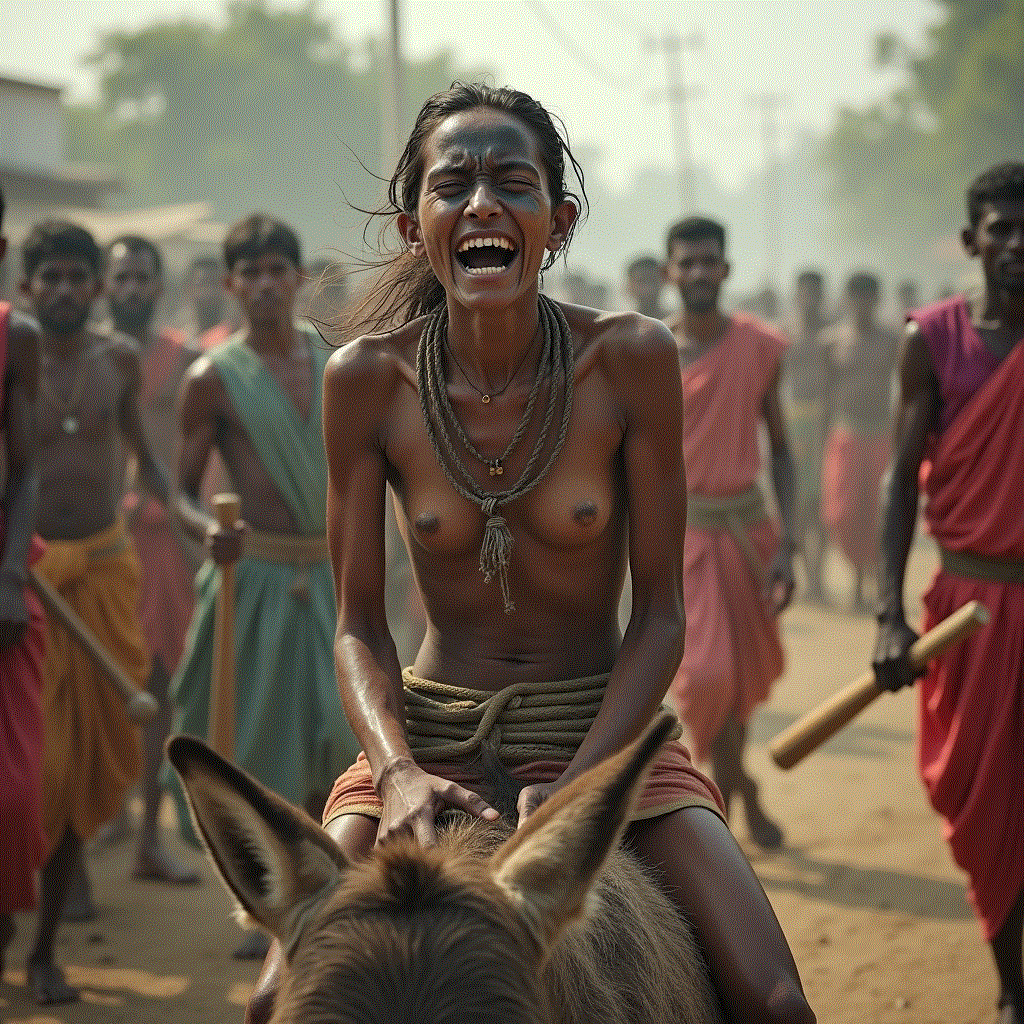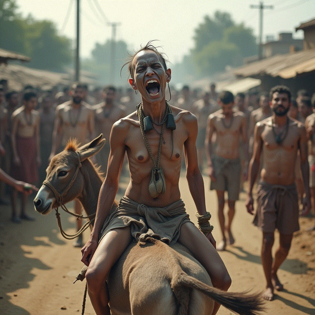 The donkey ride is still carried out in remote villages in India. The woman is stripped, sometimes tonsured, her face blackened with charcoal, shoes strung around her neck.