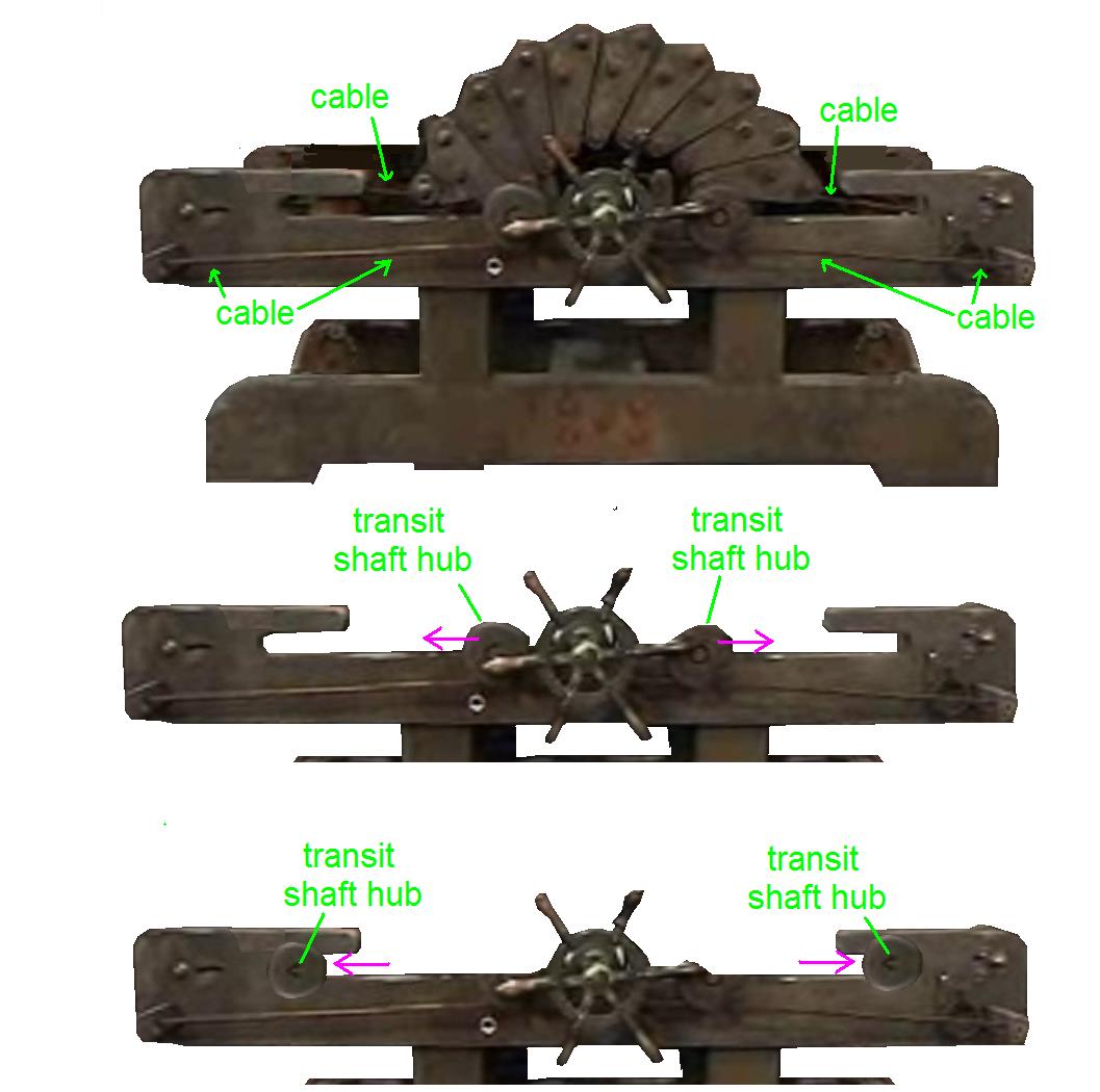 We can start with what's obvious; there is a cable attached to what I'm calling transit shafts at either side of the boat wheel ( only the hubs are visible from this perspective) it's safe to assume based on the slide space that they transit in the slide space when the boat wheel is turned, Next movable parts; the wedges each have 2 bolts near the top, but only the uppermost is attached to a cross-member, so I've Imagined an unseen component ( because it's on the inside ( shown in pink)) connecting the bolts, fixed at top with a slide for the lower, green shows their placement So now I know how it works, still don't know what it was built to do. But its definitely too small to stretch an adult human.