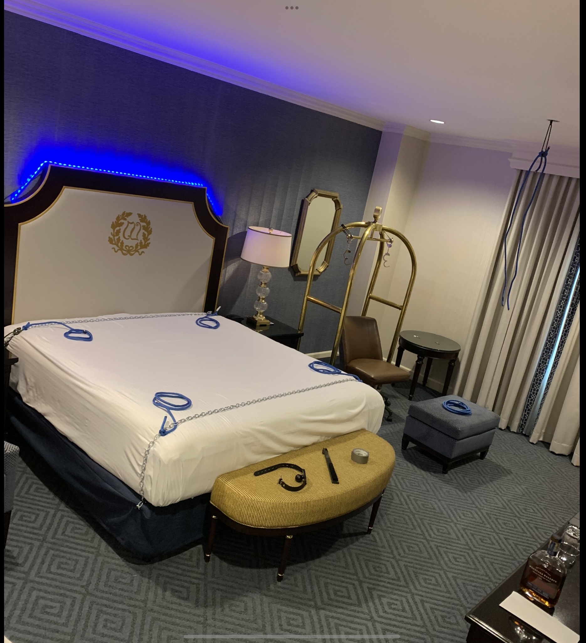 My sexy little “Russian spy” encounter on Monday evening was a memorable one. It was at a hotel room, not in an elaborate dungeon - so I didn’t have access to much in the way of props and equipment… but if you look carefully you can see the prep work I put in for the evening. Three stations for interrogation: the converted luggage gurney for a sitting AOH with cuffs; a standing AOH (the hanging ropes); and the king bed, with chains and ropes. You make do with what you can!
