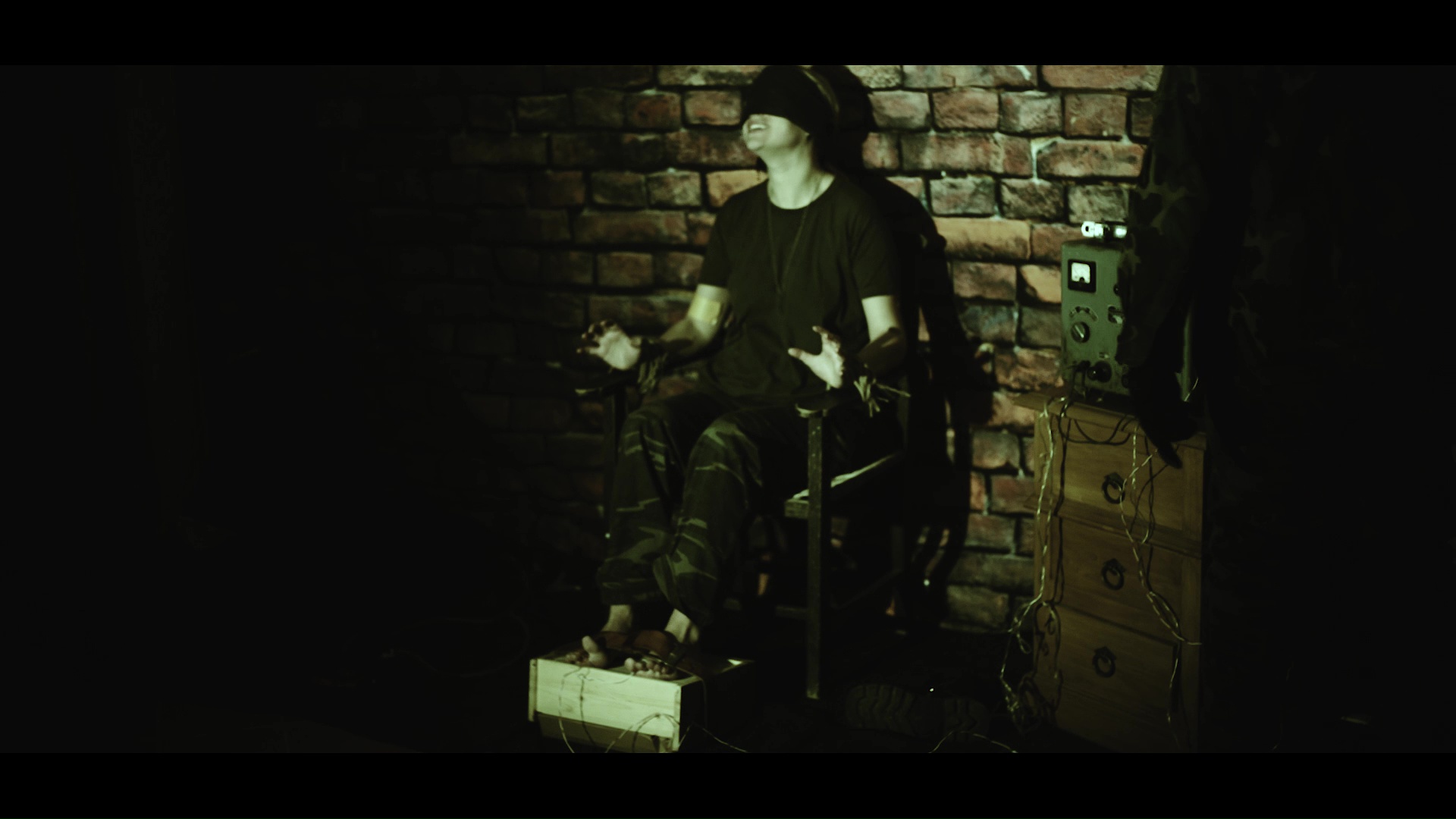 Soldier Vanessa is strapped to an electric chair ready to for the interrogation. First she wears a military shirt and she is electrocuted several times. Then they remove her shirt leaving her naked from the chest . As the voltage surges, her tits jiggle, her mouth vomits a bloody, and her feet arch, toes curling in a grotesque rhythm. (more than 5 minutes of feet arching scenes) Finally Vanessa's body convulses, her feet flexing, soles smeared with sweat and vomit, as she's ravaged, butchered, and broken, her spirit shattered, her body reduced to a twisted, bloody fetishistic spectacle.