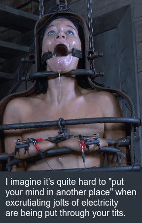 A beautiful woman is kidnapped by a cruel sadist.She is taken to his dungeon and tied to a torture frame.The sadist admires her body as he cuts off all her clothes.He stuffs a rag in her mouth and covers it with duct tape.Electrodes are clamped tightly onto both of her nipples.The sadist turns on the control box for the electrodes.He grins with excitement at the pain he will cause her....