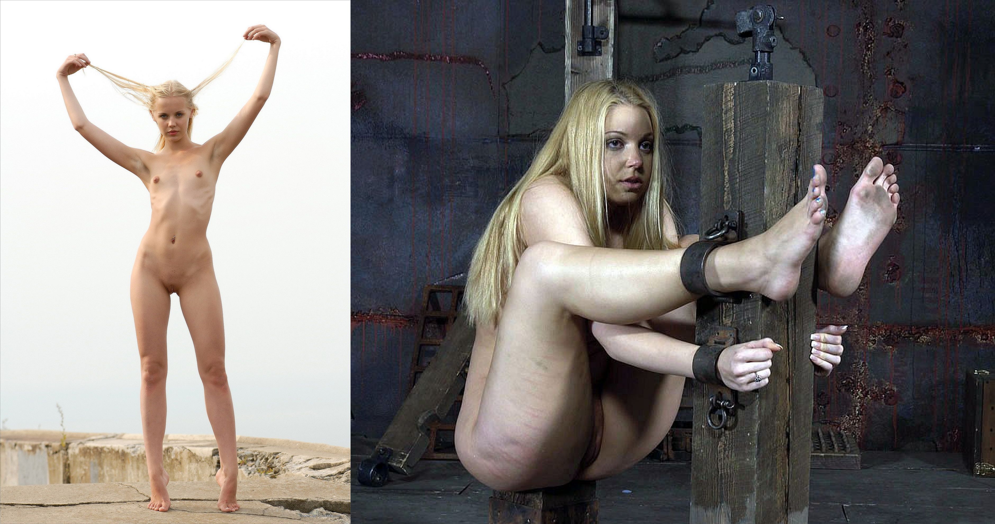 We don't know anything about her body structure, but I guess she is a white little teenager (18 + a few months old), 160-165 cm tall, 50 kg, long natural straight hair (black or brown, I ignored 3rd picture), beautiful face, big eyes, long lashes, thin neck (perfect for squeezing for hours), narrow shoulders, small firm breasts, satin-like skin, small and firm buttocks (perfect for tanning with a little beating), beautiful legs, and feet (my God) small and perfect.